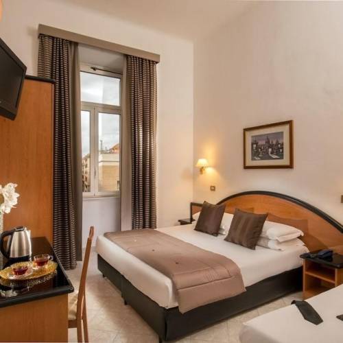Rome, ItaliaEl hotel está situado a sólo 3 km del centro de la ciudad y justo enfrente del Teatro de Opera y sólo pocos minutos de la de la estación de tren de Termini. El hotel cuenta con un recepción 24 horas, ascensor y sala de desayunos.Las habitaciones están equipadas con aire acondicionado, teléfono, minibar, baño privado y acceso a Internet.Dirección: Via del Viminale 58, 00184 Roma, Italia.