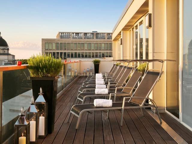 Los huéspedes también pueden disfrutar de nuestro lujoso spa de día , que ofrece una gama de relajantes tratamientos de belleza, una piscina y una vista impresionante de los tejados de Múnich.