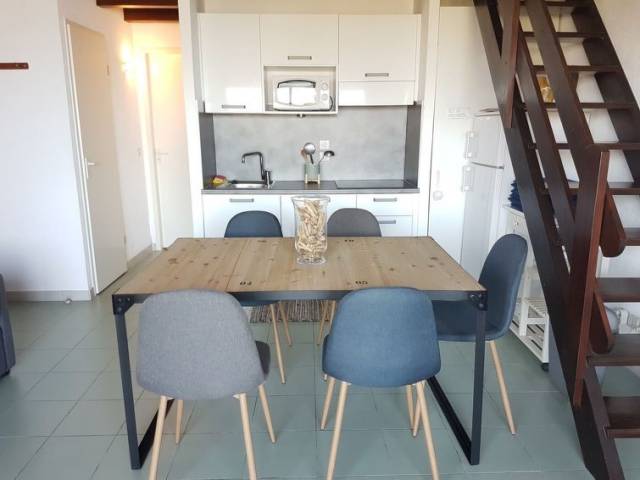 "Appartement deux chambres", apartamento en dos niveles 3 estancias 52 m2. Con mobiliario sencillo y confortable: salón-comedor con 1 sofá-cama (140 cm, 190 cm de longitud), mesa de comedor y TV (pantalla plana), aire acondicionado. Salida a la terraza. 1 dorm. con 1 cama de matrimonio (140 cm, 190 cm de longitud). Rincón-cocina (2 placas de vitrocerámica, hervidor de agua eléctrico, microondas, cafetera eléctrica). Baño, WC separado. Calefacción eléctrica. Planta superior: 1 dorm., abuhardillado con 1 cama de matrimonio (140 cm, 190 cm de longitud). Terraza 10 m2. Muebles de terraza. Vista al mar. Plaza de aparcamiento junto a la casa. A tener en cuenta: apartamento para no fumadores. Detector de humo. Oferta de un propietario comercial según el art. 155, IV, CGI