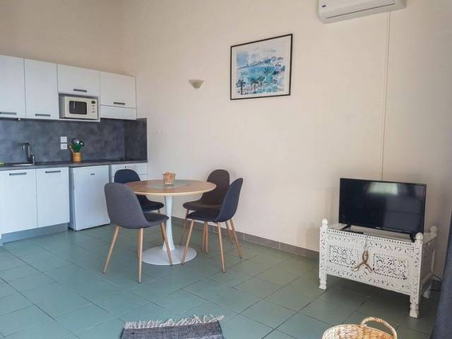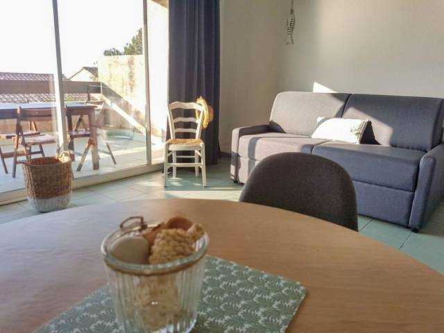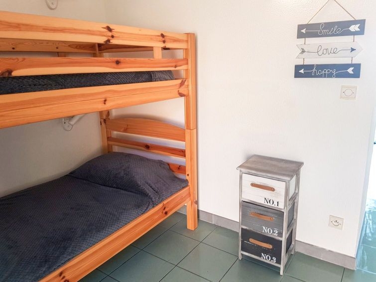 "Studio Cabine" estudio 36 m2. Vivienda adecuada para 2 adultos + 2 niños. Con mobiliario sencillo y confortable: salón-dormitorio con 1 sofá-cama doble (140 cm, 190 cm de longitud), mesa de comedor y TV (pantalla plana), aire acondicionado. Salida a la terraza. Cabina con 1 x 2 literas (90 cm, 190 cm de longitud). Rincón-cocina (2 placas de vitrocerámica, hervidor de agua eléctrico, microondas, cafetera eléctrica). Baño, WC separado. Calefacción eléctrica. Terraza 10 m2. Muebles de terraza. Vista al mar. Plaza de aparcamiento junto a la casa. A tener en cuenta: adecuado para familias. Apartamento para no fumadores. Detector de humo. Oferta de un propietario comercial según el art. 155, IV, CGI