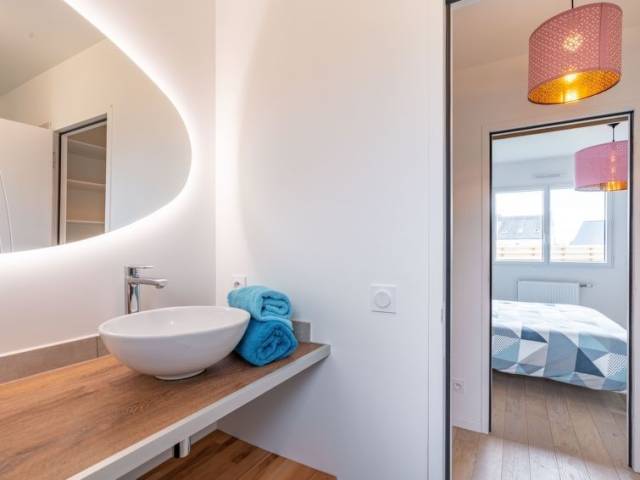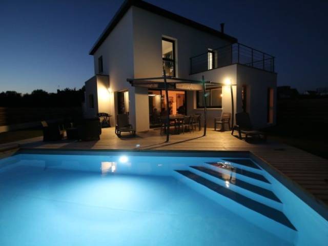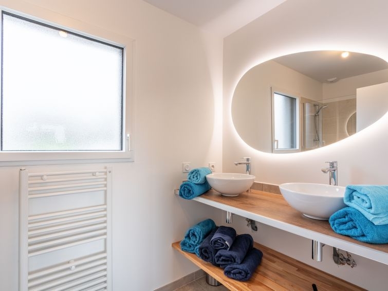 "Lagon bleu", casa 4 estancias. Con mobiliario confortable y moderno: salón-comedor grande con ventanal con mesa de comedor y TV. Salida a la terraza, pérgola, a la piscina, orientación sur. 1 dorm., grande con 1 cama de matrimonio (160 cm, 200 cm de longitud), ducha y doble lavabo. Cocina abierta (horno, lavavajillas, 4 Placas de inducción, tostadora, hervidor de agua eléctrico, microondas, cafetera eléctrica, Cápsulas de café (Nespresso) extra) con barra americana. WC separado. Planta superior: 1 dorm. con 1 cama de matrimonio (140 cm, 190 cm de longitud). 1 dorm. con 1 cama (90 cm, 190 cm de longitud), 1 x 2 literas (80 cm, 190 cm de longitud). Altillo abierto con 1 sofá-cama doble (140 cm, 190 cm de longitud). Salida a la terraza. Ducha, WC separado. Calefacción eléctrica. Balcón terraza grande 50 m2, orientación sur. Muebles de terraza, tumbonas (4). El alojamiento dispone de: lavadora, plancha, trona, cuna hasta 2 años, secador de pelo. Internet (Wifi). A tener en cuenta: casa para no fumadores. 1 mascota / perro. Detector de humo. La disponibilidad de las camas es flexible. Aunque haya más camas disponibles que la ocupación máxima, esta no se puede exceder.