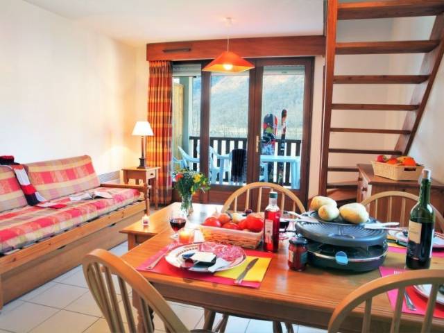 "La Soulane", apartamento de 3 estancias 40 m2. Salón-dormitorio con 1 sofá-cama doble (2 x 90 cm, 190 cm de longitud), mesa de comedor y alquiler de TV opcional (pantalla plana). Salida al balcón, a la terraza. Rincón-cocina (lavavajillas, 4 placas de vitrocerámica, tostadora, hervidor de agua eléctrico, microondas, cafetera eléctrica). Planta superior: 1 dorm. con 1 cama de matrimonio (140 cm, 190 cm de longitud). 1 dorm. con 2 camas (90 cm, 190 cm de longitud). WC separado, baño o ducha. Calefacción eléctrica. Balcón pequeño o terraza pequeña. Muebles de balcón. Vista al lago y a las montañas. El alojamiento dispone de: plancha, trona (extra). Internet (Wifi, extra). A tener en cuenta: apartamento para no fumadores. Permitido máximo 1 mascota / perro. Detector de humo. El alojamiento es una casa tipo ejemplo o un apartamento tipo ejemplo.