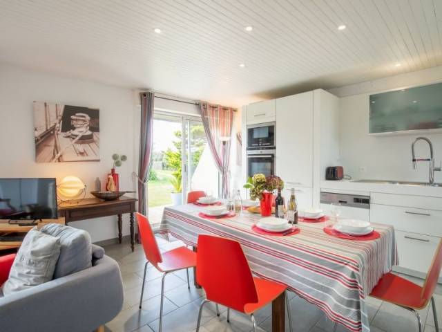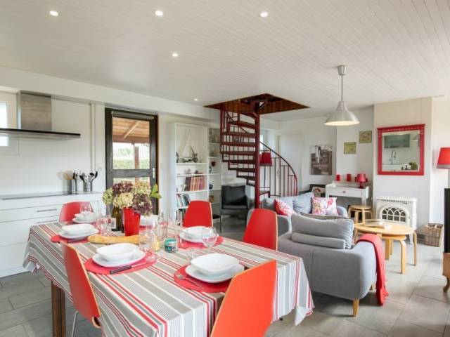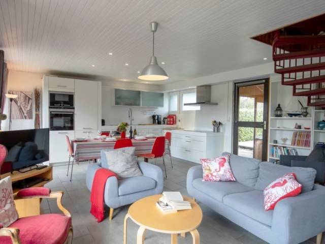 "Le Voilier (KER230)", casa 4 estancias 90 m2 en 2 plantas. Con mobiliario bonito y agradable: salón-comedor con chiminea nórdica, mesa de comedor, TV, radio y CD. Salida a la terraza, al balcón acristalado. 1 dorm. con 1 cama de matrimonio (140 cm, 190 cm de longitud). Salida a la terraza. Cocina abierta (horno, lavavajillas, 4 Placas de inducción, tostadora, hervidor de agua eléctrico, microondas, congelador, cafetera eléctrica). Ducha/WC. Calefacción eléctrica. Planta superior: (escalera de caracol) 1 dorm., abuhardillado con 1 cama de matrimonio (140 cm, 190 cm de longitud). 1 dorm., abuhardillado con 2 camas (90 cm, 190 cm de longitud). 2 terrazas, orientación suroeste y orientación norte. Muebles de terraza, barbacoa (portátil), tumbonas (2). El alojamiento dispone de: lavadora, plancha, trona, cuna. Internet (Wifi, gratis). A tener en cuenta: casa para no fumadores. Permitido máximo 1 mascota / perro. Detector de humo.
