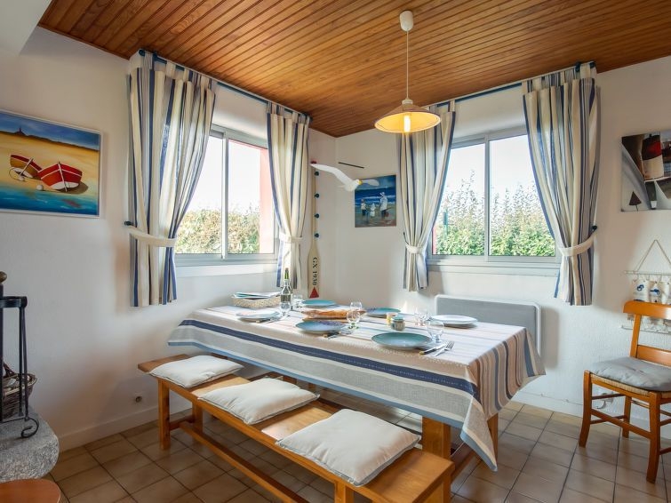 "Trouz Ar Mor (KER213)", casa 5 estancias 90 m2 en 2 plantas. Con mobiliario bonito y de buen gusto: salón-comedor con chimenea, mesa de comedor, TV satélite y equipo de música. Salida a la terraza. Cocina abierta (1 fogón, horno, lavavajillas, 3 fuegos, tostadora, hervidor de agua eléctrico, microondas, congelador, cafetera eléctrica). Baño, WC separado. Planta superior: salón abuhardillado. 3 dorm., abuhardillados, cada habitación con 1 cama de matrimonio (140 cm, 190 cm de longitud). Ducha/WC. Calefacción eléctrica. Terraza, orientación sur. Muebles de terraza, barbacoa (portátil), tumbonas (2). El alojamiento dispone de: lavadora, plancha, trona, cuna. A tener en cuenta: casa para no fumadores. Permitido máximo 1 mascota / perro. Detector de humo.