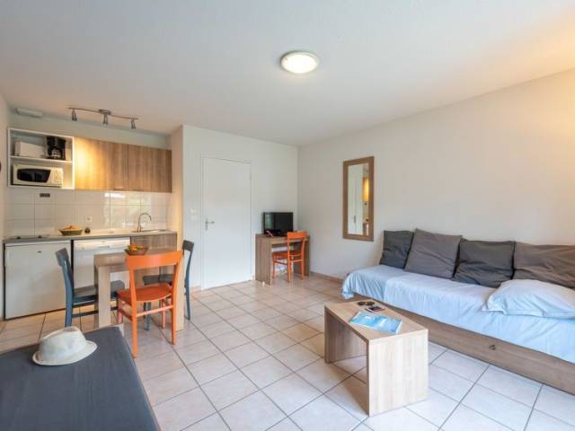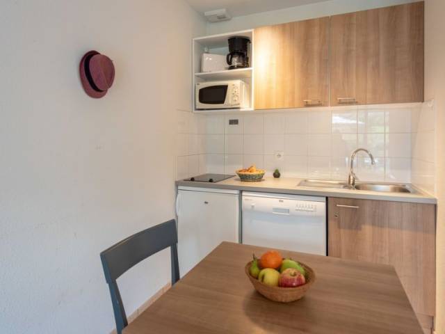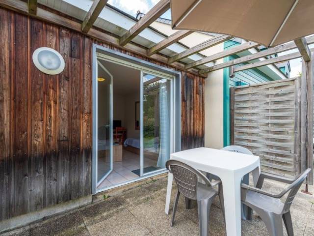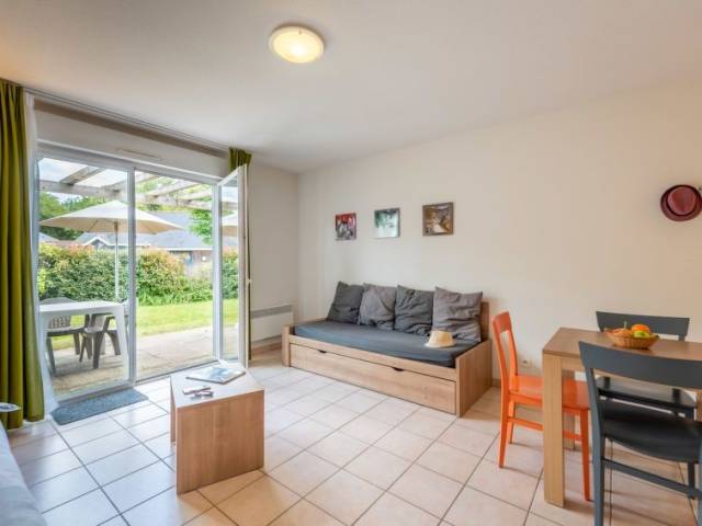 "Cottage Confort 3 Pers.", casa adosada estudio 29 m2. Con mobiliario funcional: salón-dormitorio con 1 sofá-cama (80 cm, 190 cm de longitud), 1 sofá-cama doble (140 cm, 190 cm de longitud), mesa de comedor y TV. Salida a la terraza. Rincón-cocina (2 fogones, tostadora, microondas, cafetera eléctrica). Baño, WC separado. Calefacción eléctrica. Terraza. Muebles de terraza. El alojamiento dispone de: trona, cuna (extra). Internet (Wifi, extra). A tener en cuenta: 2 mascotas / perros. Detector de humo.