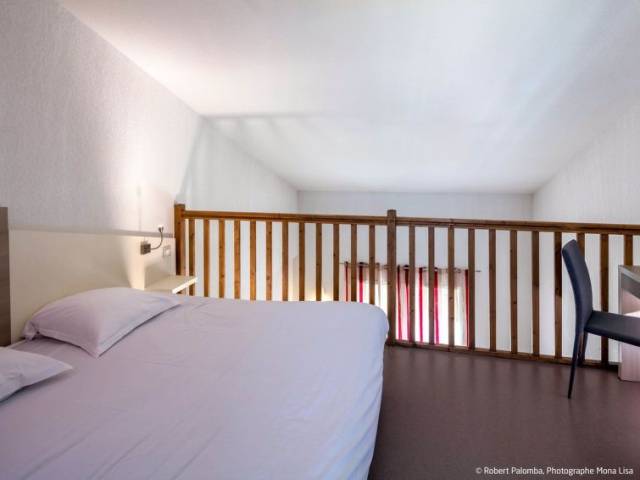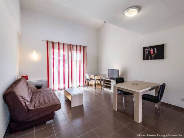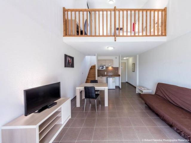"Le Domaine de Bacchus (SIH101)", casa adosada estudio 44 m2 en 2 plantas. Luminoso, con mobiliario funcional y moderno: salón-dormitorio con 1 sofá-cama doble (130 cm), mesa de comedor y TV. Salida a la terraza. Rincón-cocina (2 placas de vitrocerámica, hervidor de agua eléctrico, microondas, cafetera eléctrica). WC separado. Planta superior: altillo con 1 cama de matrimonio (160 cm). Ducha. Calefacción eléctrica. Terraza. Muebles de terraza. El alojamiento dispone de: trona, cuna (extra). Internet (Wifi, extra). A tener en cuenta: 2 mascotas / perros. Detector de humo. Oferta de un propietario comercial según el art. 155, IV, CGI