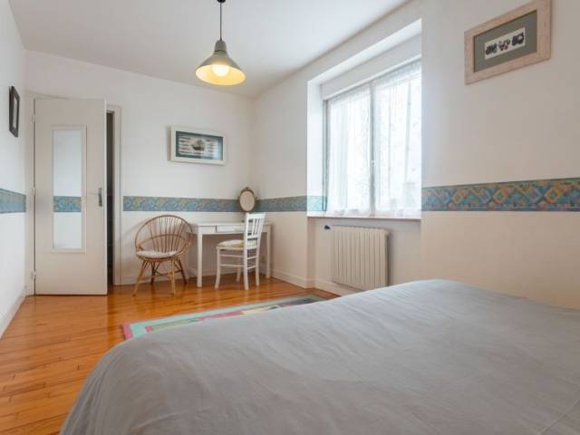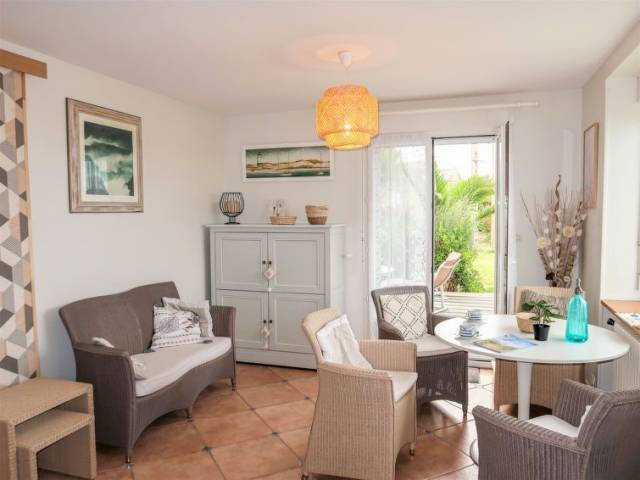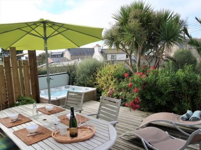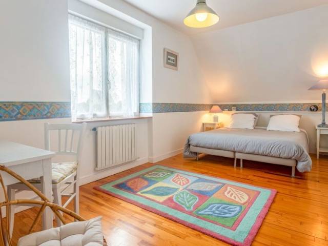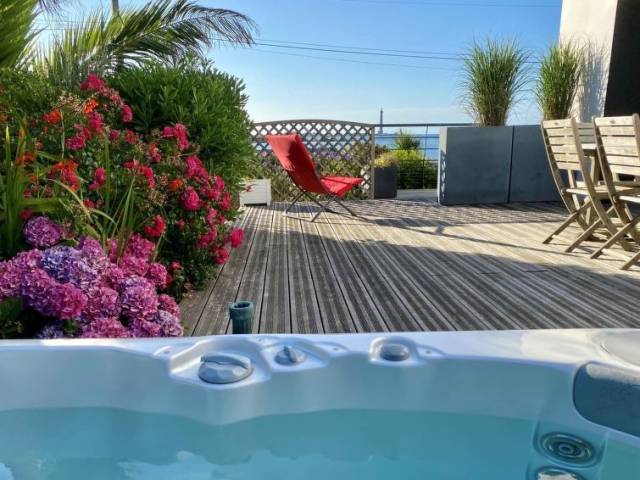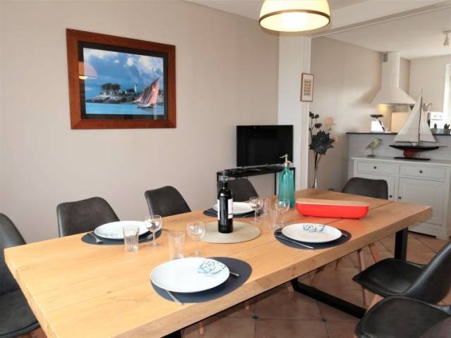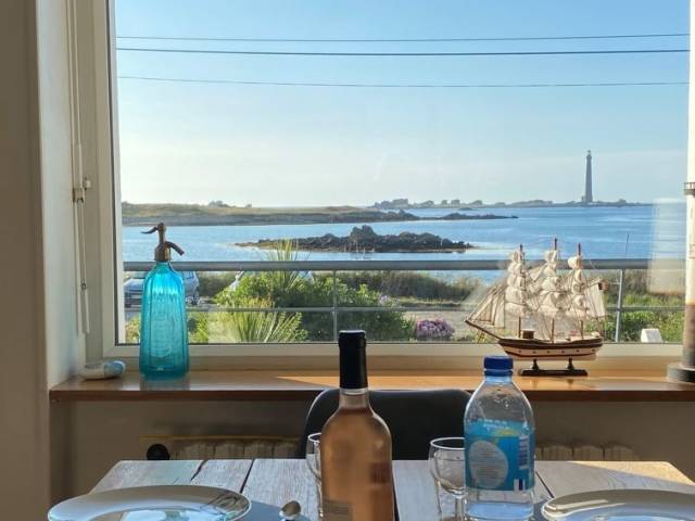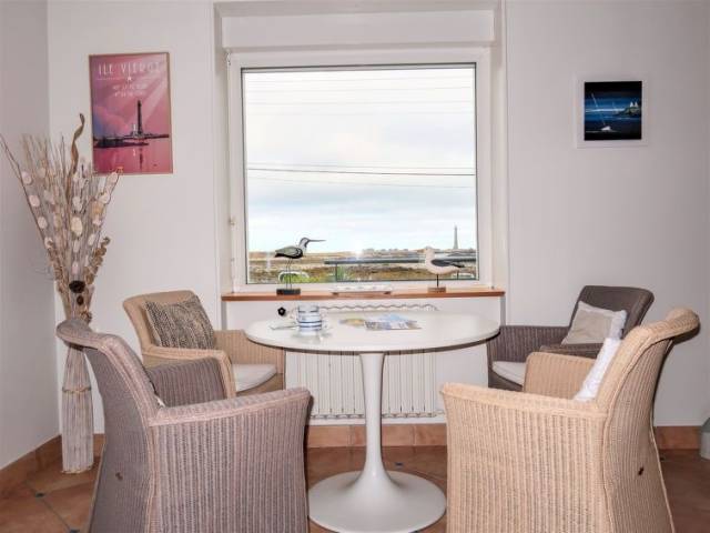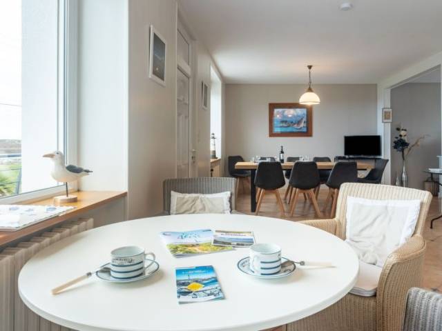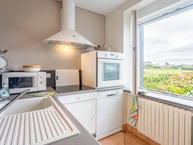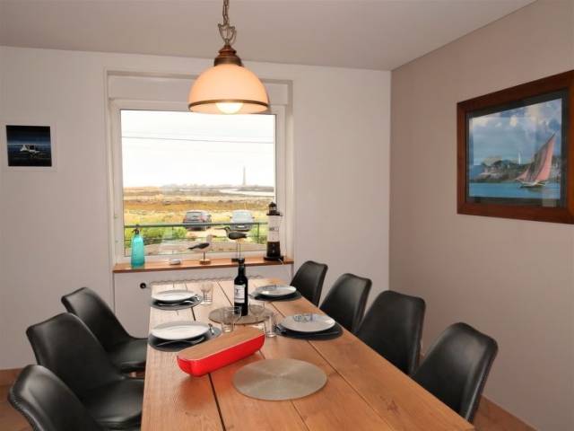 "L'Air du Large", casa 5 estancias 110 m2 en 2 plantas, en planta baja elevada, orientación noroeste. Espacioso y luminoso, con mobiliario bonito y de buen gusto: salón-comedor grande con mesa de comedor, TV satélite, canales internacionales, pantalla plana, radio y DVD. Salida al jardín, a la terraza. Sala de estar pequeña. Pequeña cocina abierta (lavavajillas, 3 Placas de inducción, tostadora, hervidor de agua eléctrico, microondas, congelador, cafetera eléctrica). WC separado. Calefacción gasóleo. Planta superior: 1 dorm. con Vestidor con 1 cama de matrimonio (160 cm, 190 cm de longitud). 2 dorm., cada habitación con 1 cama de matrimonio (140 cm, 190 cm de longitud). Ducha. Terraza 32 m2, orientación noroeste y orientación suroeste. Muebles de terraza, barbacoa (portátil), tumbonas (4). Vista panorámica muy bonita al mar. El alojamiento dispone de: lavadora, plancha, trona, cuna hasta 2 años. Internet (Wifi, gratis). A tener en cuenta: adecuado para familias. Casa para no fumadores. Permitido máximo 1 mascota / perro. Detector de humo.
