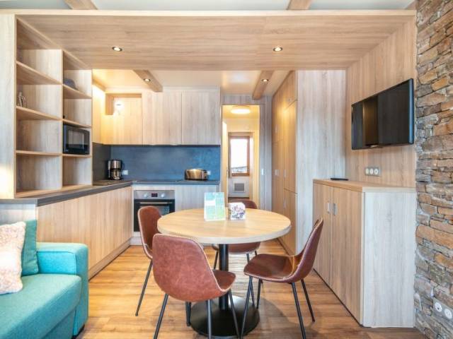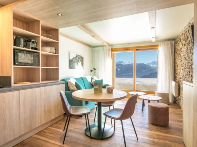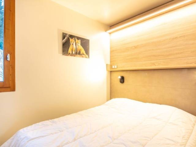 Apartamento de 2 estancias 27 m2. Salón-dormitorio con 1 sofá-cama doble y TV (pantalla plana). Salida al balcón. 1 dorm. con 2 posibilidades para dormir. Rincón-cocina (horno, lavavajillas, 2 placas de vitrocerámica, tostadora, hervidor de agua eléctrico, microondas, congelador, cafetera eléctrica, Cápsulas de café (Nespresso) extra). Ducha/WC. Calefacción. Balcón. Tumbonas. Vista al valle. El alojamiento dispone de: secador de pelo. Internet (Wifi, gratis). Plaza de aparcamiento. Permitido máximo 1 mascota / perro.