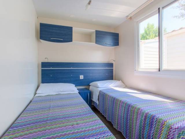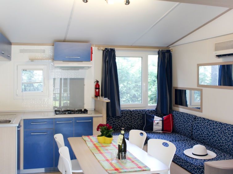 4 estancias mobile home 34 m2. Luminoso, con mobiliario funcional: 1 dorm. doble. 2 dorm., cada habitación con 2 camas. Cocina-comedor (Estufa de gas, 4 fuegos, microondas, congelador) con mesa de comedor, TV satélite. Ducha, WC separado. Aire acondicionado, aire caliente. Terraza 14 m2, cubierta. Muebles de terraza. El alojamiento dispone de: cuna (extra). Plaza de aparcamiento (1 coche).