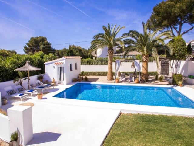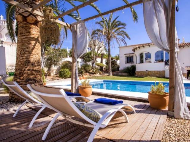 "Villa Darlin", villa 5 estancias 200 m2. Espacioso y luminoso, reformada, con mobiliario muy confortable y bonito: salón-comedor con TV satélite y ventilador. Salida a la terraza-jardín, a la piscina. 1 dorm. con 1 cama de matrimonio (160 cm, 200 cm de longitud), TV satélite, aire acondicionado y bomba de calor, caliente. 1 dorm. con 1 cama de matrimonio (160 cm, 200 cm de longitud), TV satélite, aire acondicionado y bomba de calor, caliente. 1 dorm. con 1 cama de matrimonio (220 cm, 200 cm de longitud), TV satélite, aire acondicionado y bomba de calor, caliente. Sala de billar con aire acondicionado y bomba de calor, caliente. Salida a la terraza, a la piscina. Cocina abierta (4 fogones, horno, lavavajillas, tostadora, hervidor de agua eléctrico, microondas, congelador, cafetera eléctrica). Baño/WC, ducha/WC. Terraza grande, cenador grande. Muebles de terraza, barbacoa, tumbonas. El alojamiento dispone de: lavadora, secadora, plancha, trona, cuna, secador de pelo. Internet (ADSL, gratis). VT-495755-A