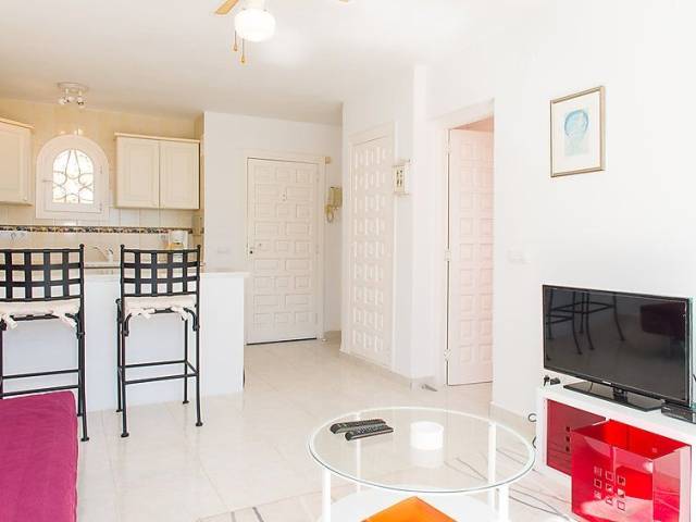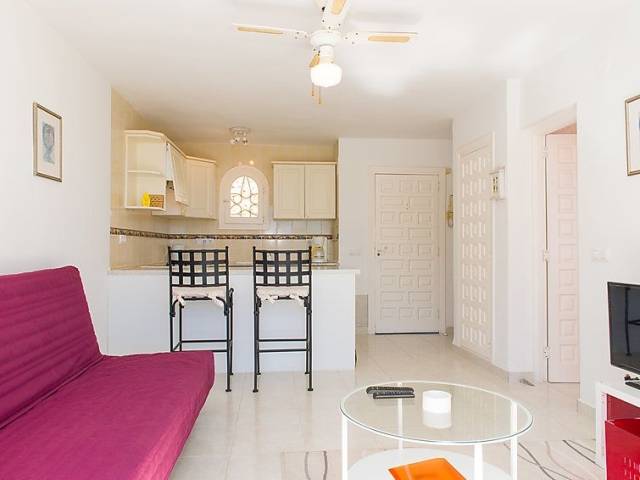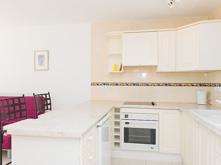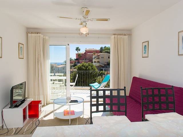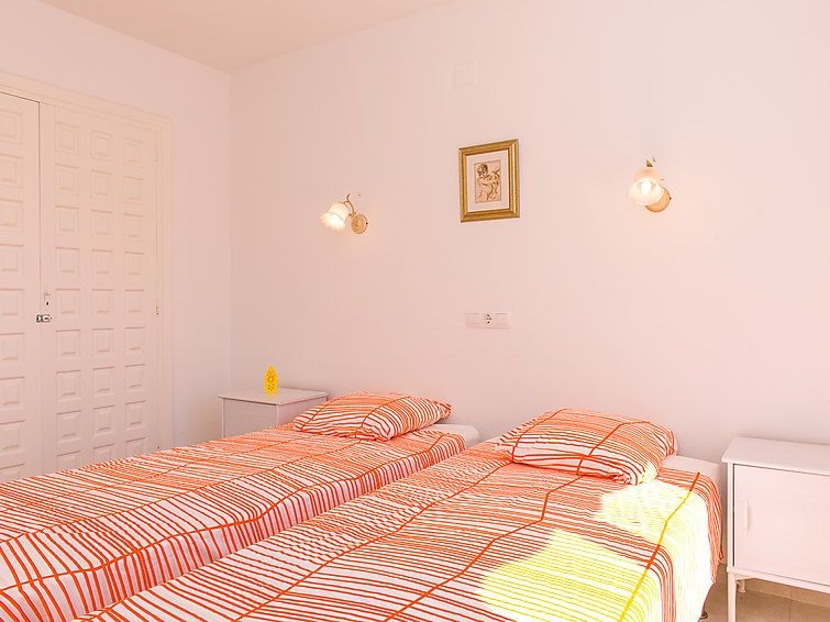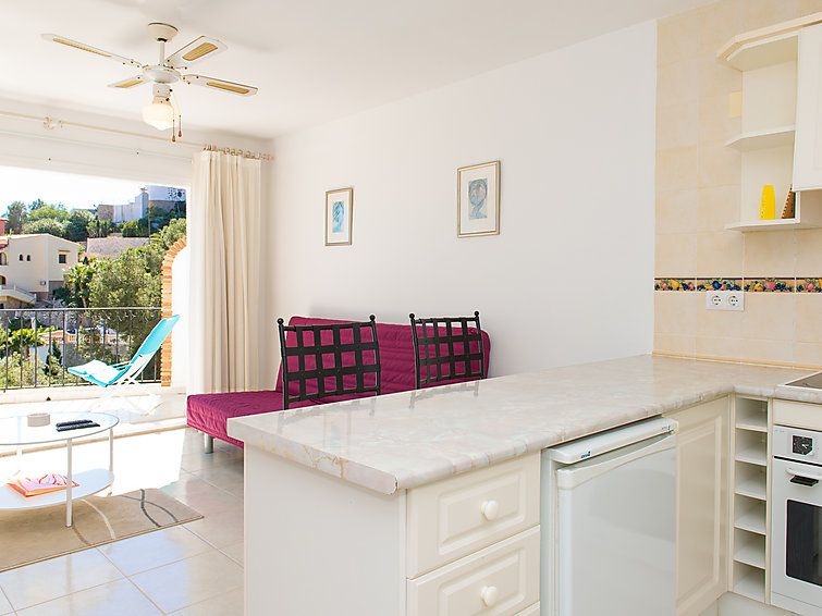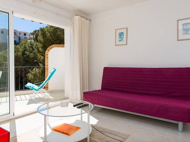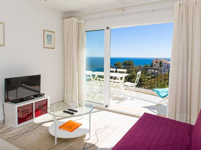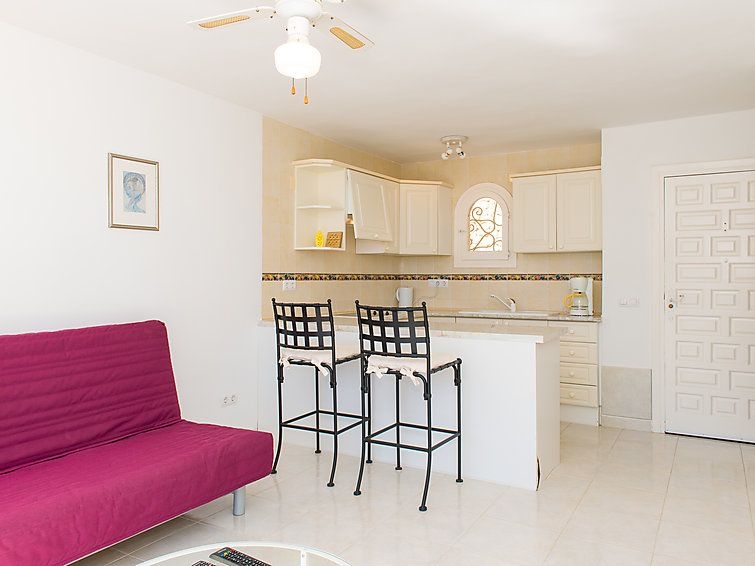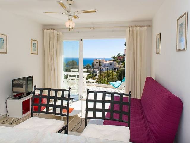 Casa adosada 2 estancias 42 m2, en la planta baja. Con mobiliario funcional: salón-comedor con TV satélite (pantalla plana), ventilador. Salida a la terraza. 1 dorm. con 2 camas (90 cm, 200 cm de longitud), ventilador. Cocina abierta (horno, 4 placas de vitrocerámica, hervidor de agua eléctrico, cafetera eléctrica, Cápsulas de café (Tassimo)). Baño/WC. Calefacción eléctrica. Terraza 13 m2. Muebles de terraza. Vista panorámica espléndida al mar. El alojamiento dispone de: lavadora. A tener en cuenta: nevera sin congelador. 1 mascota / perro. TV solamente FR. Este apartamento no dispono de canales españoles. AT-446954-A