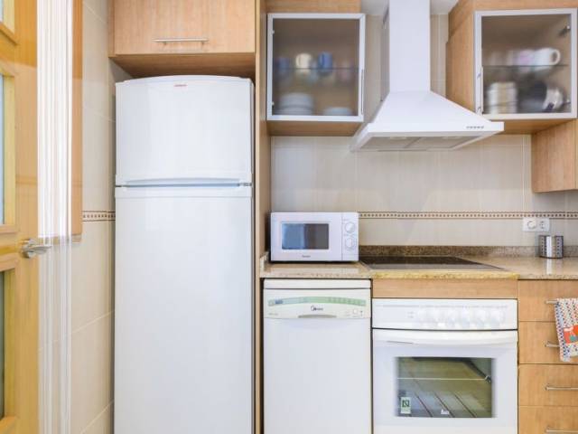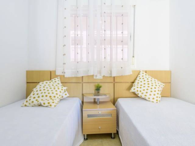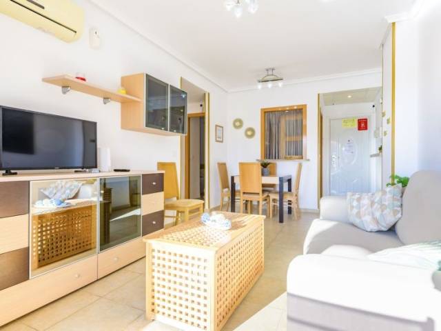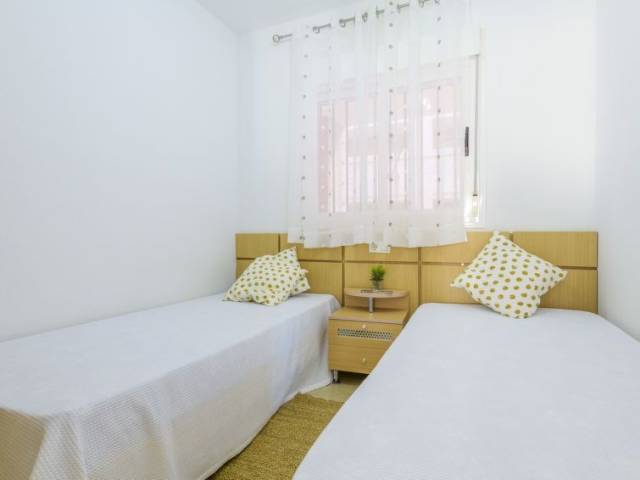 "Torremar", apartamento de 3 estancias 60 m2 en el 5° piso. Luminoso, con mobiliario funcional: salón-comedor con mesa de comedor, TV digital y pantalla plana. Salida a la terraza. 1 dorm. con 1 cama de matrimonio (135 cm, 190 cm de longitud). 1 dorm. con 2 camas (90 cm, 190 cm de longitud). Cocina (horno, lavavajillas, 4 placas de vitrocerámica, tostadora, microondas, congelador) con pasa-platos. Baño/bidet/WC. Calefacción no en todas las estaciones. Terraza. Muebles de terraza. El alojamiento dispone de: lavadora, plancha, secador de pelo. Internet (Wifi, gratis). Plaza de aparcamiento (cubierto) junto a la casa. A tener en cuenta: apartamento para no fumadores. 1 mascota pequeña / perro. R000000001