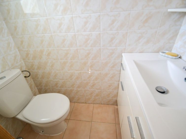 Cambrils Badia a 2 km de Cambrils: Casa adosada "Raquel", confortable de 2 plantas. A 900 m del centro de Cambrils, lugar tranquilo, soleado, zona con poco tráfico, a 400 m del mar, a 400 m de la playa. Comunitario: jardín con césped, piscina rectangular (10 x 5 m, 90 - 180 cm de profundidad, Disponible por temporada: 01.May. - 30.Sep.) con escalera interior. Piscina para niños, ducha exterior, posibilidad de aparcamiento en la calle. Supermercado 400 m, restaurante, bar 150 m, parada de autobús 200 m. Puerto deportivo 1 km. Atracciones en los alrededores: Port Aventura 5 km. Grupos de jóvenes sólo bajo petición. Casa adosada 3 estancias 70 m2. Con mobiliario funcional y confortable: salón-comedor con 1 sofá-cama doble, chimenea, TV digital y radio. Salida a la terraza. Cocina (4 fogones, horno, lavavajillas, tostadora, microondas, cafetera eléctrica). WC separado. Calefacción no en todas las estaciones. Planta superior: 1 dorm. con 1 cama de matrimonio (135 cm, 190 cm de longitud). 1 dorm. con 2 camas (90 cm, 190 cm de longitud). Baño/WC. Terraza. Muebles de terraza, barbacoa. El alojamiento dispone de: lavadora, plancha, secador de pelo. Internet (Wifi, gratis). Adecuado para familias. HUTT-000295