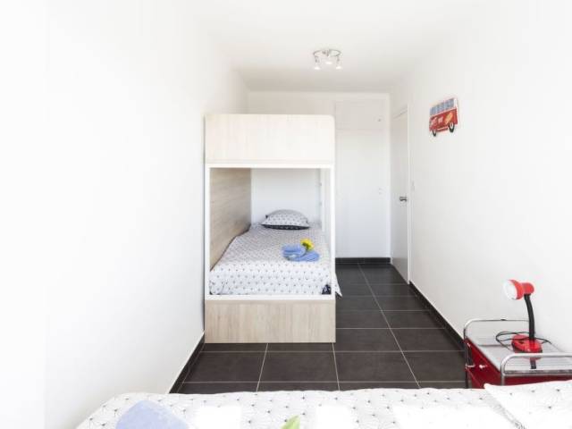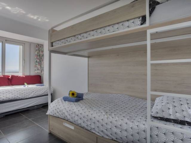 Apartamento de 3 estancias 52 m2 en el 6° piso, orientación suroeste. Luminoso, completamente reformado en 2017, con mobiliario moderno y de buen gusto: salón-comedor con mesa de comedor, TV satélite, TV digital, aire acondicionado y bomba de calor, caliente. Salida a la terraza, orientación sur y orientación oeste. 1 dorm. con 1 cama de matrimonio (160 cm), aire acondicionado y bomba de calor, caliente. Salida a la terraza. 1 dorm. para niños con 1 x 2 literas, 1 cama-nido (2 pers.). Cocina (horno, lavavajillas, 3 placas de vitrocerámica, microondas, congelador, cafetera eléctrica). Ducha/WC. Terraza grande 10 m2. Muebles de terraza. Vista panorámica espléndida al mar y al río. El alojamiento dispone de: lavadora. Internet (Wifi, gratis). A tener en cuenta: 1 mascota / perro. TV solamente FR, ES. HUTG044011