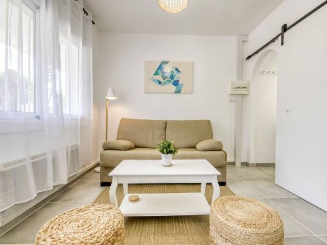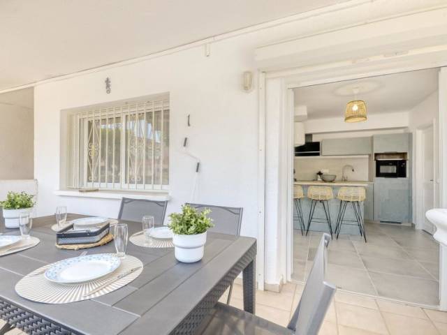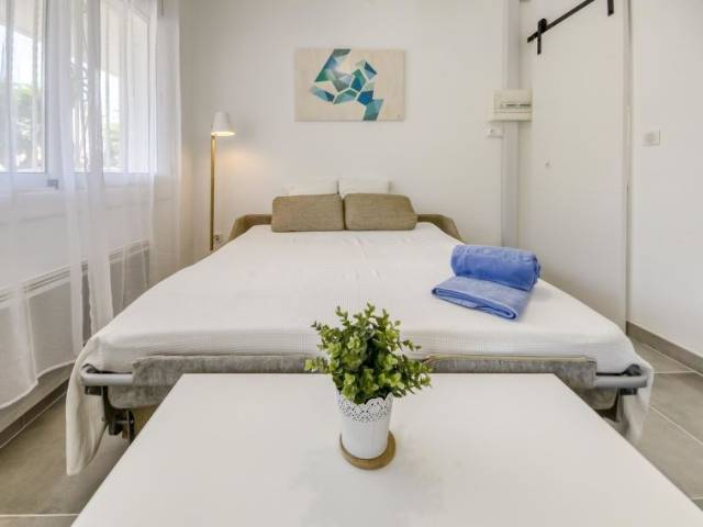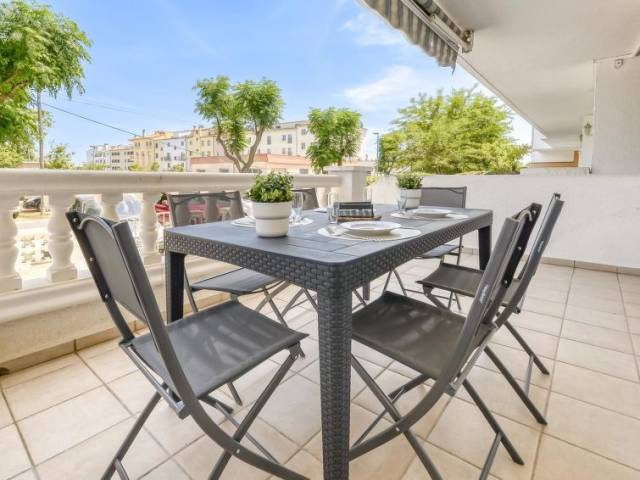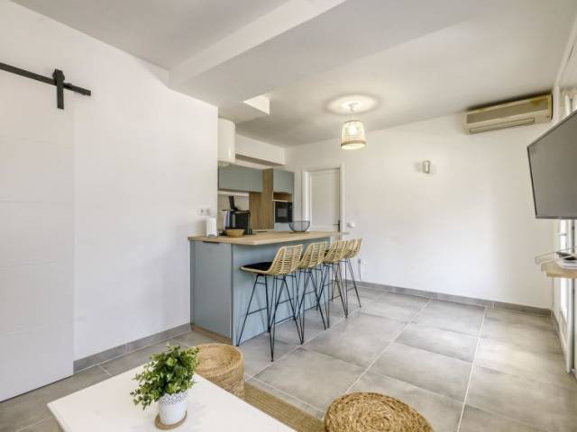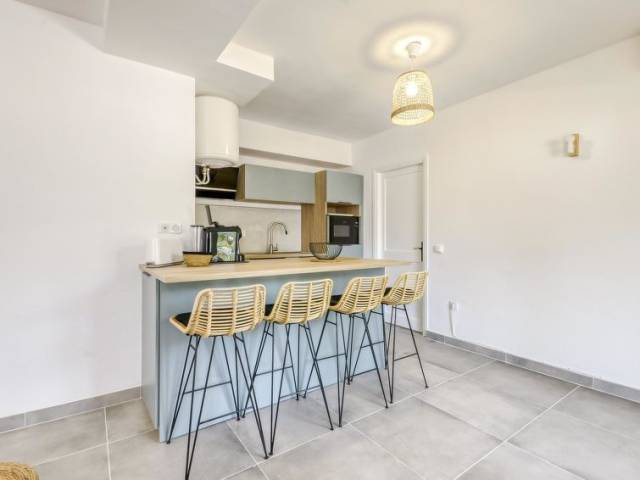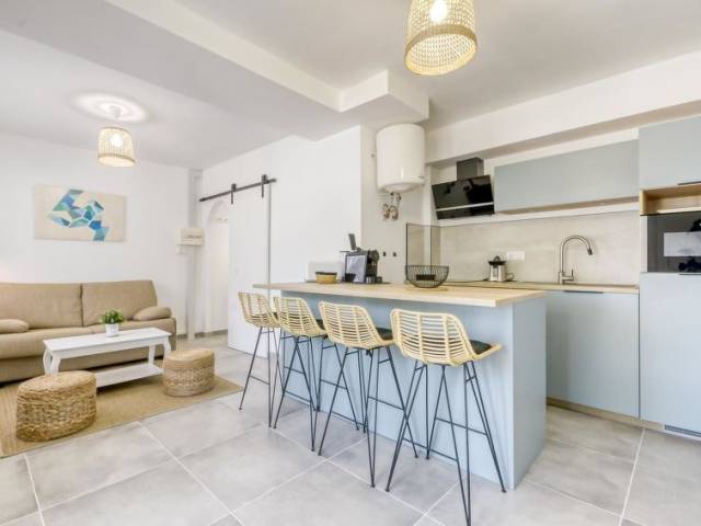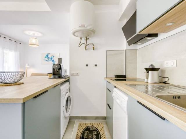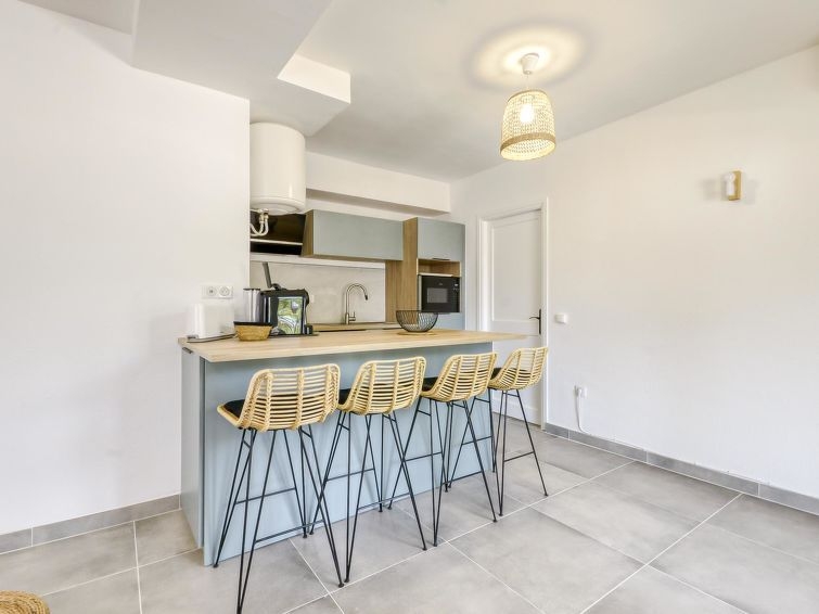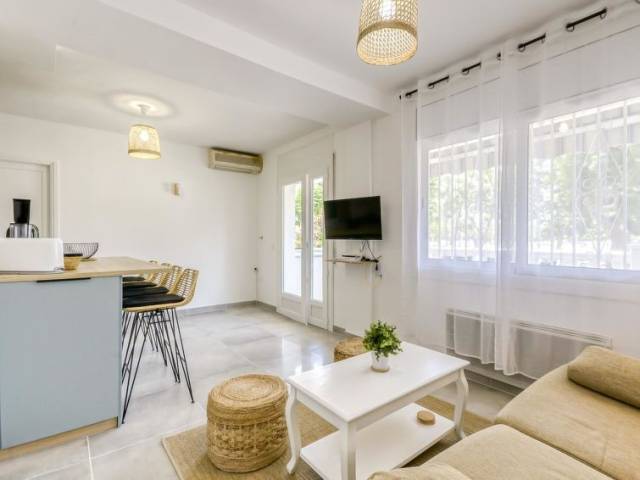 Apartamento de 2 estancias 40 m2, en entresuelo. Con mobiliario confortable y moderno: salón-comedor con 1 sofá-cama doble (140 cm, 190 cm de longitud), mesa de comedor, TV satélite, aire acondicionado y bomba de calor, caliente. Salida a la terraza. 1 dorm. con 1 cama de matrimonio (160 cm, 190 cm de longitud), aire acondicionado y bomba de calor, caliente. Cocina abierta (lavavajillas, 2 Placas de inducción, tostadora, hervidor de agua eléctrico, cafetera eléctrica, microondas/grill). Ducha/WC. Terraza 12 m2. Muebles de terraza. Vista al jardín. El alojamiento dispone de: lavadora, plancha, secador de pelo. Internet (Wifi, gratis). A tener en cuenta: apartamento para no fumadores. 1 mascota / perro. TV solamente FR. HUTG-020662