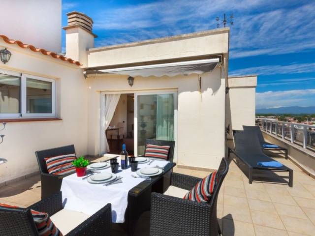 Puerto Nautico: Casa de apartamentos "Club Nautic", agradable, confortable de 6 plantas. En el sector Club Nàutic, a 300 m del centro de Empuriabrava, lugar céntrico, soleado, a 500 m del mar, a 500 m de la playa, orientación sur. En el complejo: restaurante, bar, internet café, sauna, gimnasio (extra). Solarium, ascensor. Parking público. Tienda de comestibles, supermercado 400 m, centro comercial 300 m, restaurante 100 m, bar 50 m, panadería, café 10 m, parada de autobús 3 km, estación de tren "Figueres" 12 km, playa de arena "Empuriabrava" 500 m, centro de buceo 2 km. Puerto deportivo 10 m, campo de golf (18 hoyos) 12 km, escuela de surf 1.5 km, escuela de vela 1.5 km, tenis 3 km, minigolf 1.5 km, centro ecuestre 3 km, polideportivo 50 m, rutas de senderismo desde la casa 2 km, caminos para bicicletas 1.6 km. Atracciones en los alrededores: Centro paracaídismo Skydive 3 km, Túnel del viento 3 km, Parque Acuático Aquabrava Roses 8 km, Museo Dalí Figueres 15 km, Casino y castillo de Peralada 12 km, Ruïnes de Empúries 21 km. Grupos de jóvenes sólo bajo petición. A tener en cuenta: Se pueden reservar alojamientos adicionales. Vecindario muy sensible a ruidos. Se ruega respetar la tranquilidad y normas de buen comportamiento. Ático de 3 estancias 65 m2 en el 6° piso. Vivienda adecuada para 2 adultos + 2 niños. Luminoso, con mobiliario confortable y de estilo: salón-comedor con TV satélite y TV digital. Salida a la terraza. 1 dorm. con 1 cama de matrimonio (135 cm). Salida a la terraza. 1 dorm. para niños con 1 x 2 literas (90 cm), ducha/WC. Salida al balcón. Cocina (horno, 4 placas de vitrocerámica, tostadora, microondas, congelador, cafetera eléctrica). Baño/WC. Ningún tipo de calefacción. Terraza grande 59 m2. Muebles de terraza, tumbonas (2). Vista panorámica al mar, al paisaje y al canal. El alojamiento dispone de: lavadora, secadora. Internet (Wifi, gratis). A tener en cuenta: 1 mascota / perro. TV solamente ES, FR, DE. HUTG029229