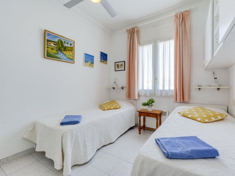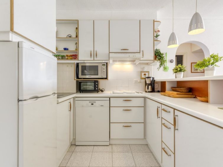 Apartamento de 3 estancias 50 m2 en el 2° piso. Con mobiliario funcional y confortable: salón-comedor con mesa de comedor, TV satélite y ventilador. Salida a la terraza. 1 dorm. con 1 cama de matrimonio (160 cm, 200 cm de longitud). 1 dorm. con 2 camas (90 cm, 190 cm de longitud), ventilador. Cocina (horno, lavavajillas, 3 placas de vitrocerámica, tostadora, hervidor de agua eléctrico, microondas, congelador, cafetera eléctrica). Baño/WC. Ningún tipo de calefacción. Terraza 10 m2. Muebles de terraza. Vista a la piscina y al jardín. El alojamiento dispone de: lavadora, plancha, secador de pelo. Internet (Wifi, gratis). Plaza de aparcamiento n. 5. A tener en cuenta: apartamento para no fumadores. TV solamente FR. Sin ascensor. R00000001
