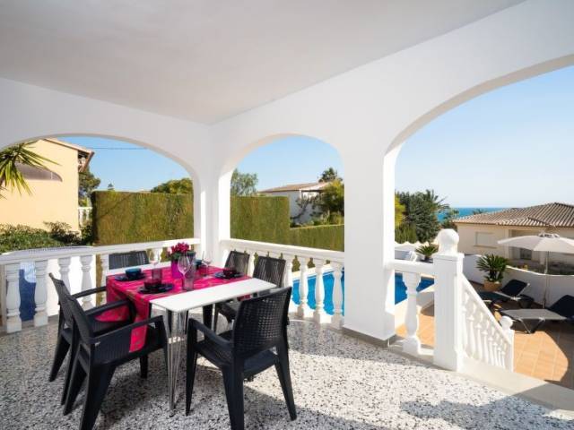 Cometa: Casa unifamiliar "Himalaya". A 1.5 km del centro de Moraira, lugar tranquilo, a 250 m del mar. Privado: terreno 770 m2, piscina (8 x 4 m, Disponible por temporada: 01.Ene. - 31.Dic.) con escalera interior. Ducha exterior, terraza, muebles de jardín, barbacoa. Supermercado 1.5 km, restaurante, bar 300 m, playa de arena 1.2 km, cala para bañarse 250 m.