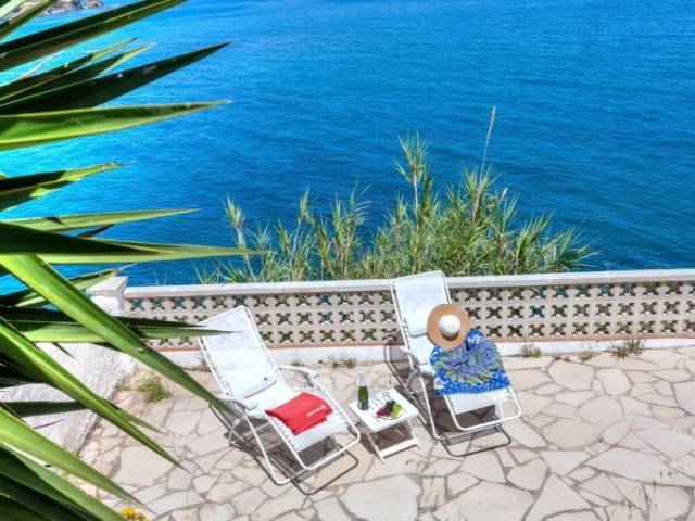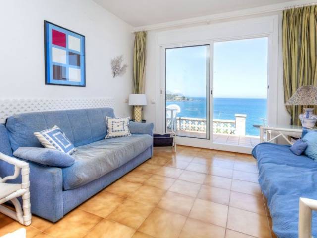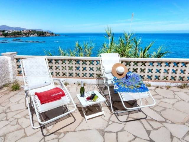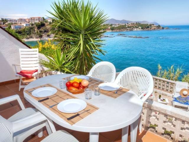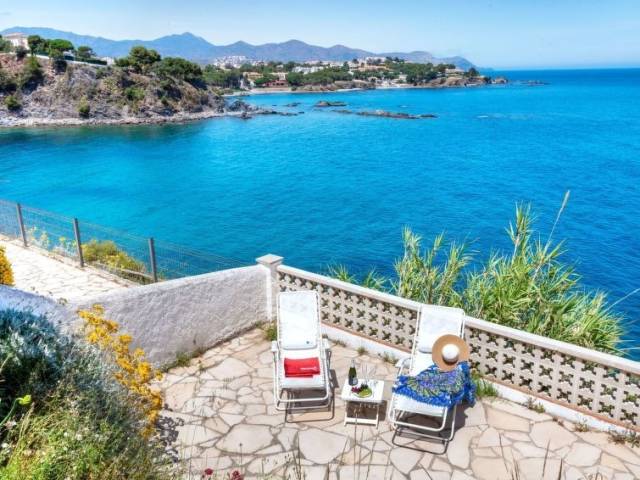 Sector Cau del LLop a 1 km de del puerto de Llançà: Casa con varias viviendas "Nicolas", de 2 plantas. Primera linea de mar, en la periferia, lugar tranquilo, soleado, a 10 m del mar. Acceso por escaleras (17 escalones) hasta la casa. Centro comercial 2 km, playa de gravilla 300 m. Tenis 800 m. Grupos de jóvenes sólo bajo petición.