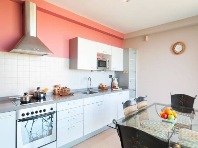 Cocina con microondas, horno, grill, mesa de comedor, rincón comedor, lavavajillas, frigorifico y congelador.