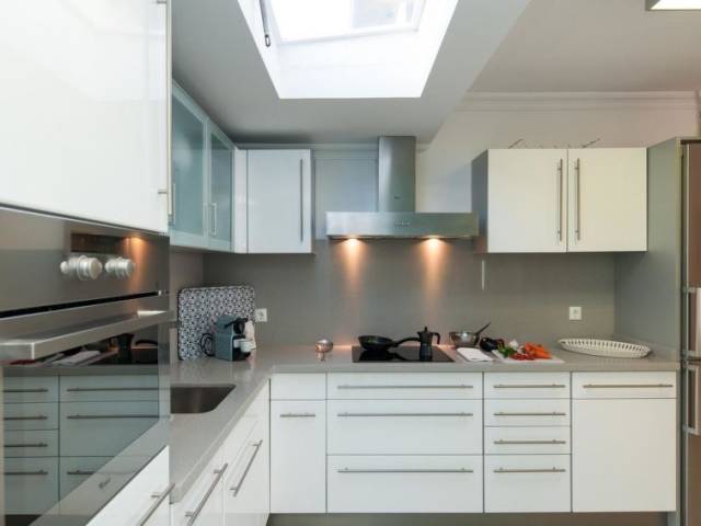 Cocina abierta con 4 quemadores, microondas, horno, mesa de comedor, lavavajillas, frigorifico y congelador.