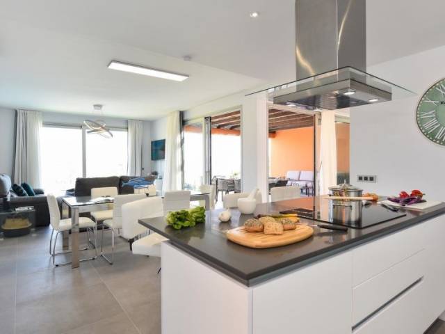 Cocina abierta con 4 quemadores, microondas, horno, mesa de comedor, lavavajillas, frigorifico y congelador. Comida: servicio a domicilio de panecillos (incluido).