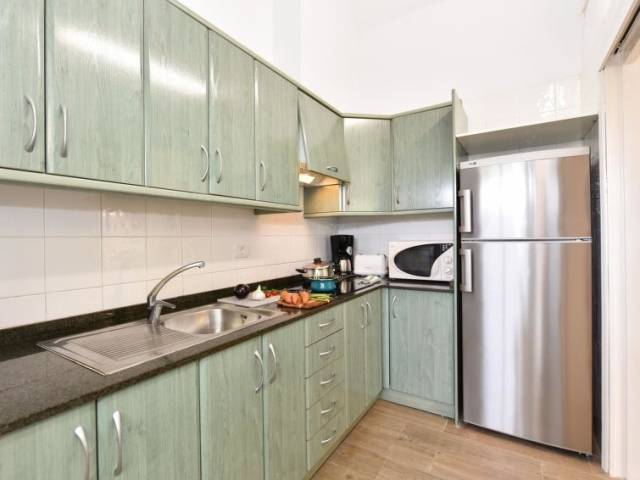 Cocina abierta con microondas, horno, frigorifico y congelador.