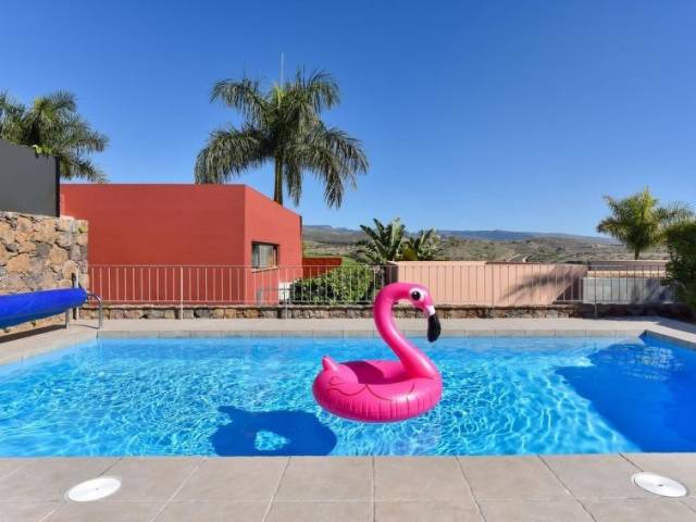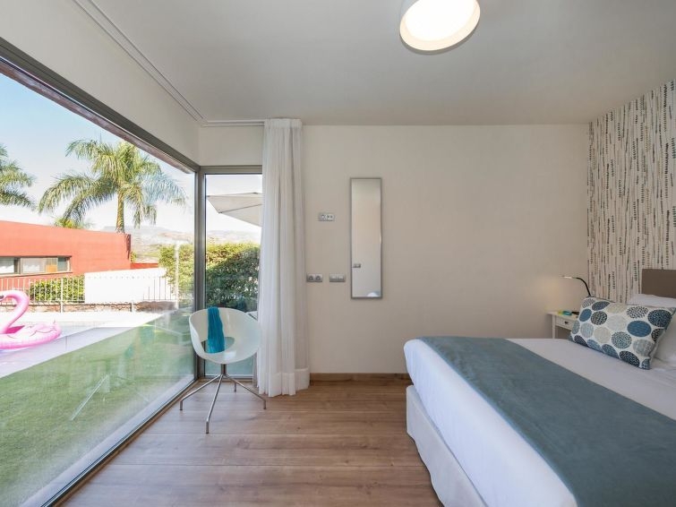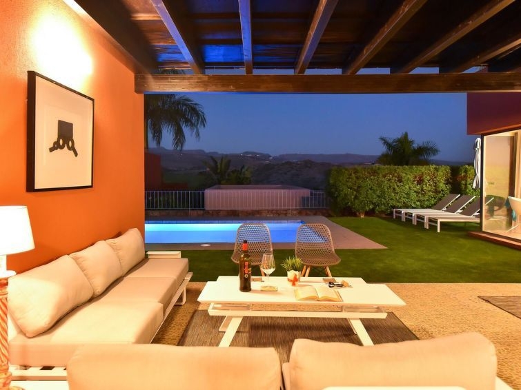 Villa, bonita, moderna "Par 4 Villa 19 with Pool Salobre". Equipamiento de la vivienda: aire acondicionado, lavadora (privado). Parking: plaza de parking reservada. Acceso en coche todo el año. Situación: en el centro de Salobre Golf Resort, en las afueras de Maspalomas, lugar aislado, tranquilo, soleado en una colina. Vista desde la vivienda al paisaje. Entorno de la vivienda: jardín (privado), piscina (privado, longitud 8 m x ancho 4 m), barbacoa (privado). Climatización de la piscina (extra: 50€/día), solicitar en la reserva y pagar en plaza. "P19", casa 5 piezas para 6 personas, 120 m2, con mobiliario confortable y moderno. Salón-comedor con TV satélite. Fumar no permitido. Internet (Wifi). Dormitorio con 1 cama doble. Dormitorio con 2 camas individuales. Dormitorio con 2 camas individuales. Cocina abierta con 4 quemadores, microondas, horno, mesa de comedor, lavavajillas, frigorifico y congelador. Baño y ducha/WC. Terraza-jardín, muebles de terraza. Otros equipamientos: caja fuerte, trona, secador de pelo, plancha, lavadora. 2019/5809