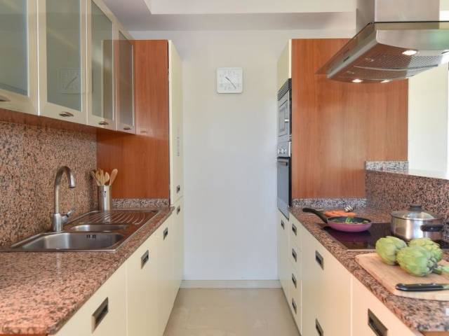 Cocina abierta con 3 quemadores, microondas, horno, mesa de comedor, lavavajillas, frigorifico y congelador.