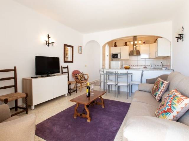 " Joel", casa adosada 2 estancias 45 m2, orientación sur. Con mobiliario funcional y confortable: salón-comedor con chimenea, barra americana, TV satélite, aire acondicionado y bomba de calor, caliente. Salida a la terraza. 1 dorm. con 2 camas (90 cm, 190 cm de longitud), calefacción eléctrica. Cocina abierta (horno, 4 placas de vitrocerámica, tostadora, hervidor de agua eléctrico, microondas, cafetera eléctrica) con barra americana. Ducha/WC. Terraza pequeña. Muebles de terraza. El alojamiento dispone de: lavadora, plancha, trona, cuna, secador de pelo. Internet (Wifi, gratis). VFT/MA/17745