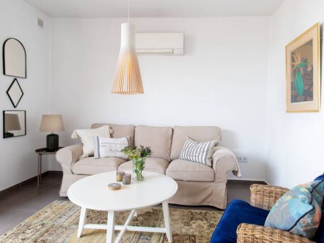 "Limoneros", apartamento de 3 estancias 73 m2, orientación sur. Espacioso y luminoso, con mobiliario muy confortable: salón-comedor con TV digital, aire acondicionado y bomba de calor, caliente. Salida a la terraza-jardín. 1 dorm. con 1 cama de matrimonio (160 cm, 200 cm de longitud). Cocina abierta (horno, lavavajillas, 4 placas de vitrocerámica, tostadora, hervidor de agua eléctrico, microondas, congelador, cafetera eléctrica). Salida a la terraza-jardín. Ducha/WC. En planta inferior: 1 dorm. con 1 cama de matrimonio (160 cm, 200 cm de longitud), ducha/WC, aire acondicionado y bomba de calor, caliente. Salida a la terraza-jardín. Terraza-jardín grande. Muebles de terraza. Vista panorámica al mar y a la localidad. El alojamiento dispone de: lavadora, plancha, trona, cuna, secador de pelo. Internet (Wifi, gratis). A tener en cuenta: un dormitorio doble está fuera del apartamento. Apartamento para no fumadores. VFT/MA69630