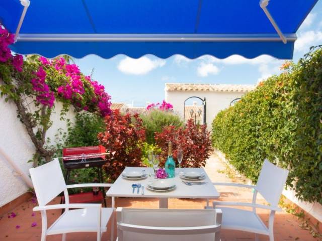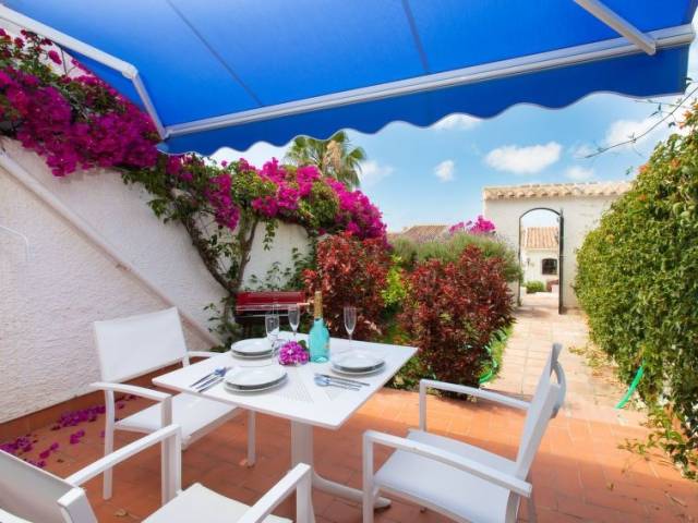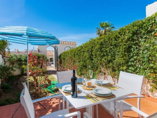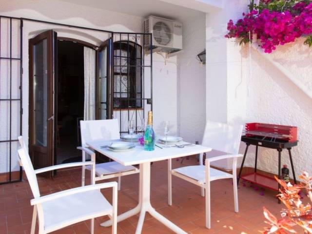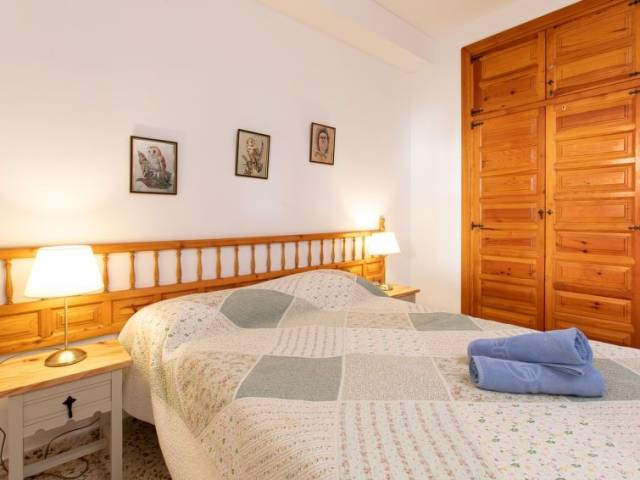 "Mañana", apartamento de 2 estancias 50 m2, orientación sur. Con mobiliario sencillo y funcional: salón-comedor con 1 sofá-cama (135 cm, 190 cm de longitud), TV digital, aire acondicionado y bomba de calor, caliente. Salida al jardín, a la terraza. 1 dorm. con 1 cama doble (150 cm, 190 cm de longitud). 1 dorm. con 2 camas (90 cm, 190 cm de longitud). Cocina abierta (horno, 4 placas de vitrocerámica, tostadora, hervidor de agua eléctrico, microondas, congelador, cafetera eléctrica). Ducha/WC. Muebles de terraza, barbacoa. Vista al jardín. El alojamiento dispone de: lavadora, plancha, trona, cuna, secador de pelo. Internet (Wifi, gratis). VFT/MA/62392