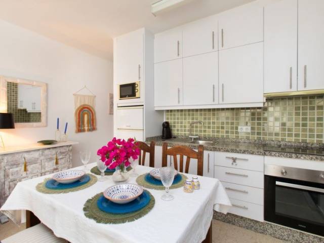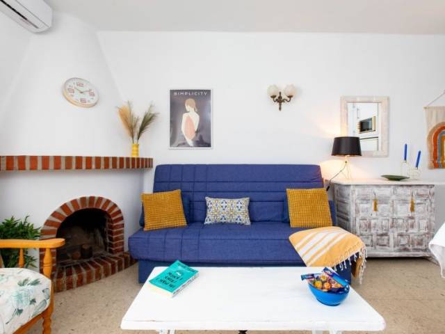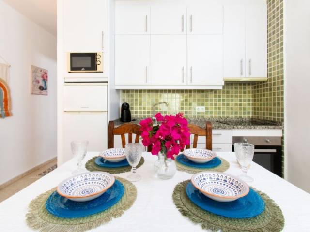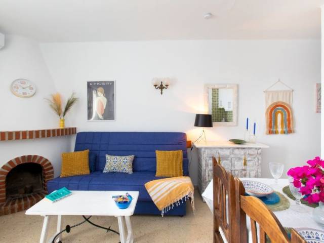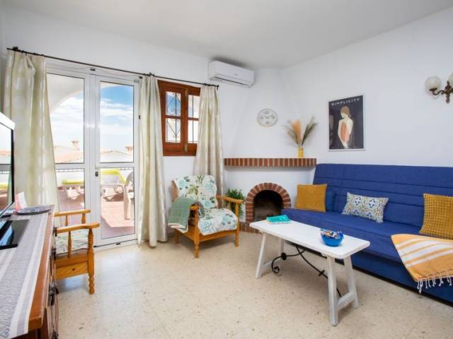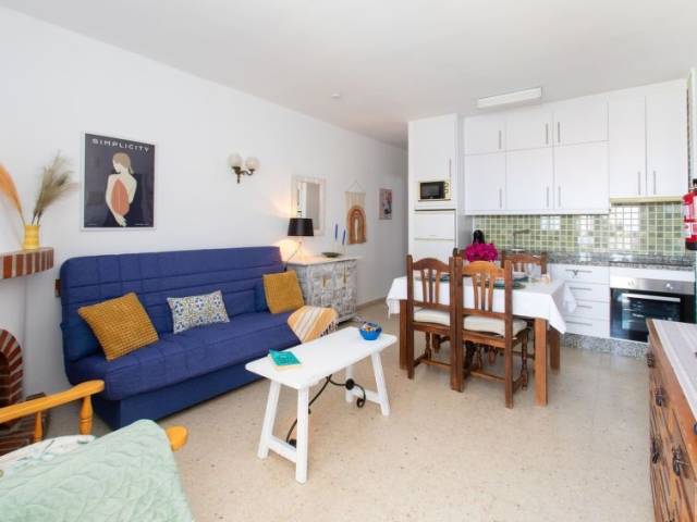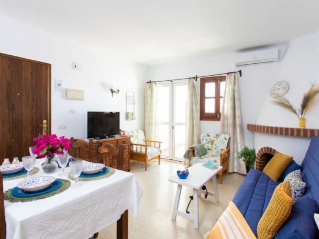 "Pueblo", apartamento de 2 estancias 50 m2. Con mobiliario rústico: salón-comedor con chimenea, mesa de comedor, TV satélite, aire acondicionado y bomba de calor, caliente. Salida a la terraza. 1 dorm. con 1 cama doble (2 x 90 cm, 190 cm de longitud). Cocina abierta (horno, 4 placas de vitrocerámica, tostadora, hervidor de agua eléctrico, microondas, cafetera eléctrica). Baño/WC. Terraza grande. Barbacoa (portátil), tumbonas. El alojamiento dispone de: lavadora, plancha, secador de pelo. Internet (Wifi, gratis). A/MA/01239