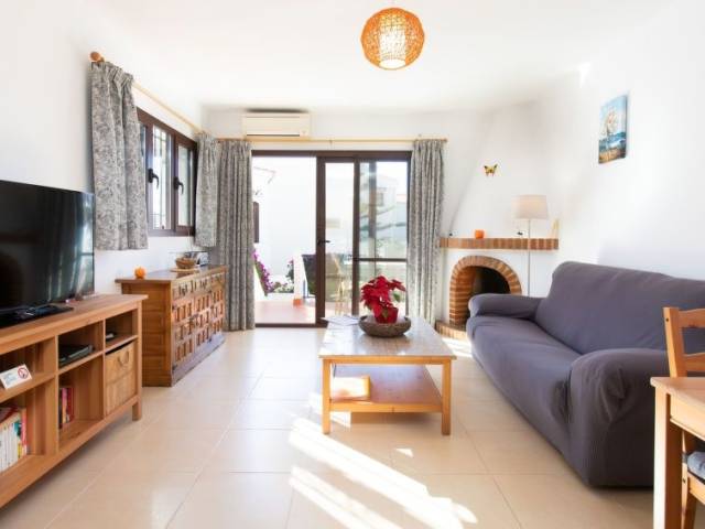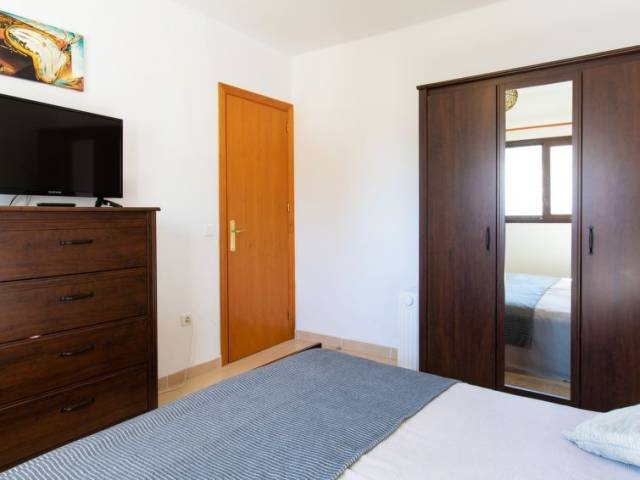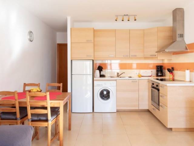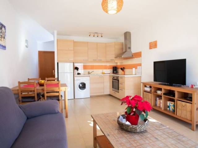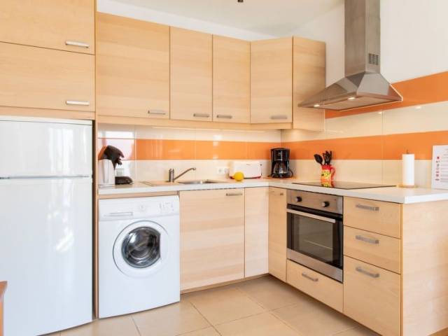 "Dali", apartamento de 2 estancias 54 m2, orientación sur. Vivienda adecuada para 2 adultos + 2 niños. Luminoso, con mobiliario sencillo y funcional: salón-comedor con 1 sofá-cama (160 cm, 200 cm de longitud), TV digital, canales internacionales, aire acondicionado y bomba de calor, caliente. Salida a la terraza-jardín. 1 dorm. con 1 cama de matrimonio (160 cm, 190 cm de longitud), calefacción eléctrica y ventilador. Cocina abierta (horno, lavavajillas, 4 placas de vitrocerámica, tostadora, hervidor de agua eléctrico, microondas, congelador, cafetera eléctrica). Ducha/WC. Muebles de terraza, barbacoa. Vista a la piscina y al jardín. El alojamiento dispone de: lavadora, plancha, mosquitera, trona, cuna, secador de pelo. Internet (Wifi, gratis). VFT/MA/60700