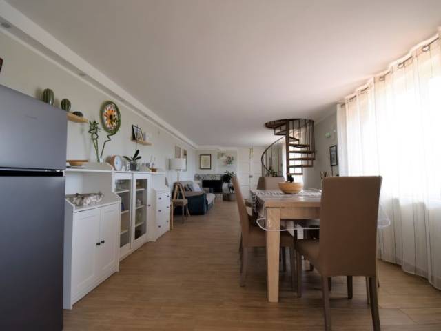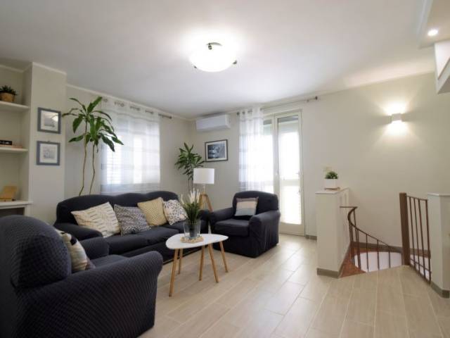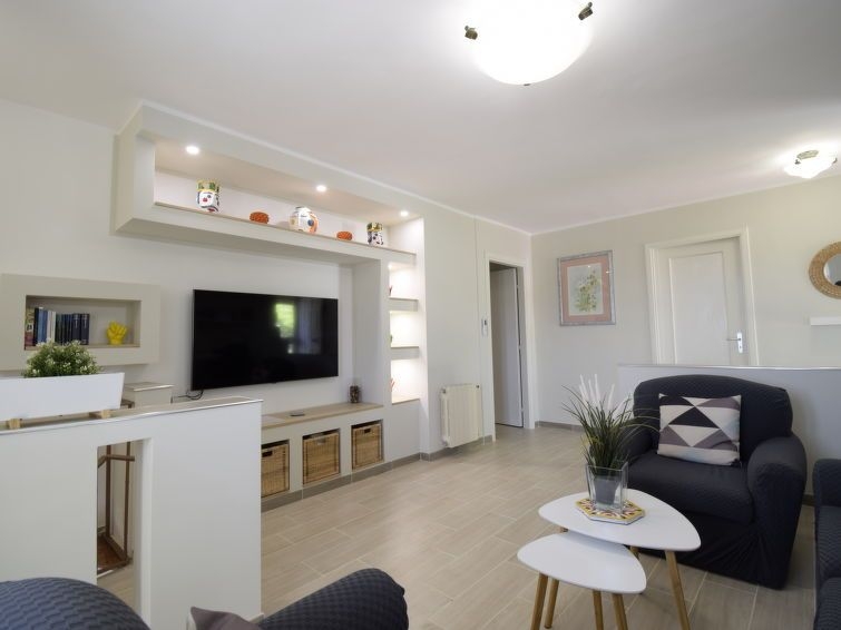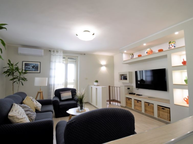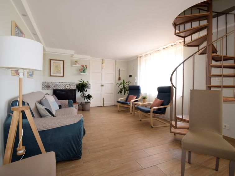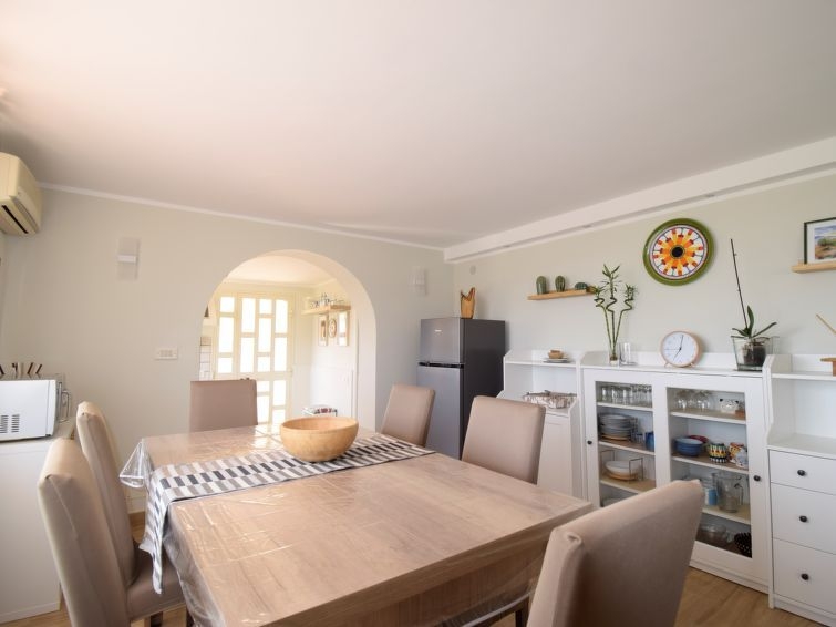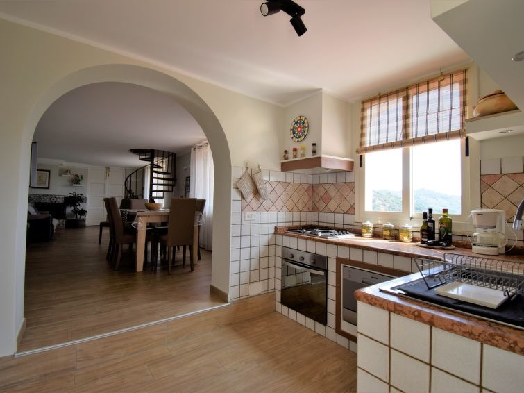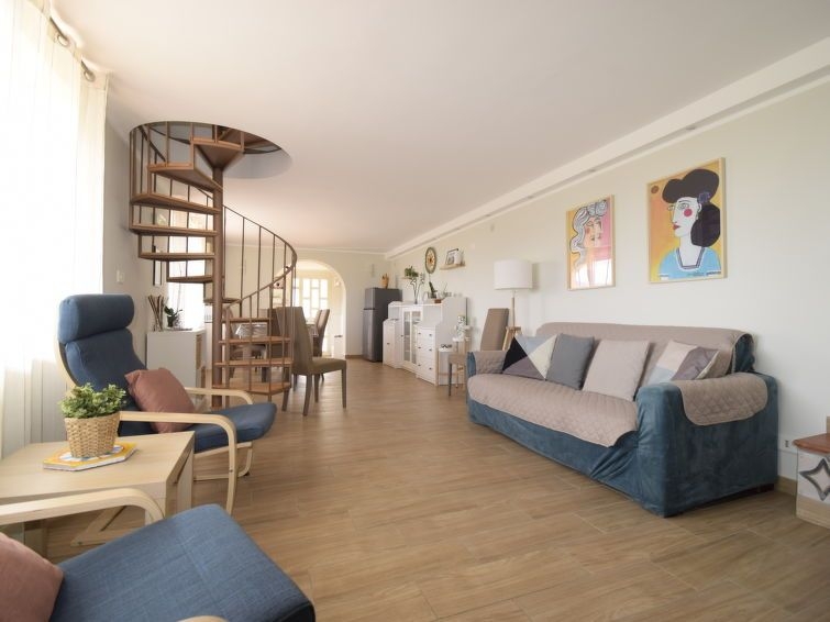 Villa 5 estancias 115 m2 en 2 plantas. Con mobiliario confortable y de buen gusto: salón-comedor con ventanal con 1 sofá-cama doble, chiminea nórdica y aire acondicionado. Rincón-cocina (4 fogones, horno, lavavajillas, microondas, congelador, cafetera eléctrica) con WC separado. Salida a la terraza. Planta superior: (escalera de caracol) salón con 1 sofá-cama doble y TV (pantalla plana), aire acondicionado. Salida al balcón. 1 dorm. doble con TV (pantalla plana), aire acondicionado. 1 dorm. con 2 camas y aire acondicionado. Ducha/bidet/WC, baño/ducha/bidet/WC. Calefacción, calefacción de leña, aire caliente. Calefacción disponible desde el 01.12. al 31.03. Balcón 15 m2, terraza 40 m2 parcialmente cubierta terraza 25 m2, cubierta. Muebles de terraza, barbacoa, tumbonas. Vista parcial al mar, a las montañas y al paisaje. El alojamiento dispone de: lavadora, plancha, mosquitera, trona, cuna hasta 2 años, secador de pelo. Internet (Wifi, gratis). Plaza de aparcamiento (2 Coches). CIR:19083034C208320