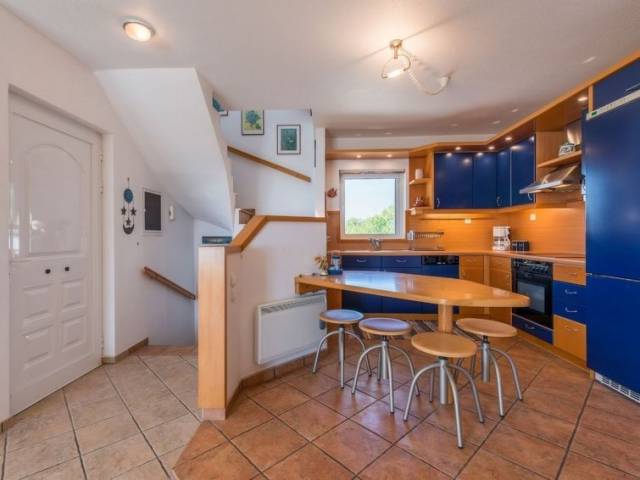 "Adamite", villa 5 estancias 90 m2 en 3 plantas. Espacioso y luminoso, con mobiliario confortable y bonito: salón abierto con chimenea y TV satélite (pantalla plana), radio, CD y DVD. Salida al jardín, a la piscina. Cocina abierta (horno, lavavajillas, 4 placas de vitrocerámica, tostadora, hervidor de agua eléctrico, microondas, cafetera eléctrica). WC separado. Aire acondicionado. En planta inferior: 1 dorm. doble con 1 cama doble y TV (pantalla plana). Ducha/WC. Aire acondicionado. Planta superior: (escaleras sin barandilla) 2 dorm. dobles, cada habitación con 1 cama doble y TV (pantalla plana). Salida al balcón. 1 dorm. doble con 2 camas y TV (pantalla plana). Salida al balcón. Baño/WC. Aire acondicionado. 2 balcones grandes. Vista bonita al mar y al paisaje. El alojamiento dispone de: lavadora, caja fuerte, plancha, secador de pelo. Internet (Wifi, gratis). A tener en cuenta: adecuado para familias un dormitorio doble está fuera del apartamento. 0208K91000279401