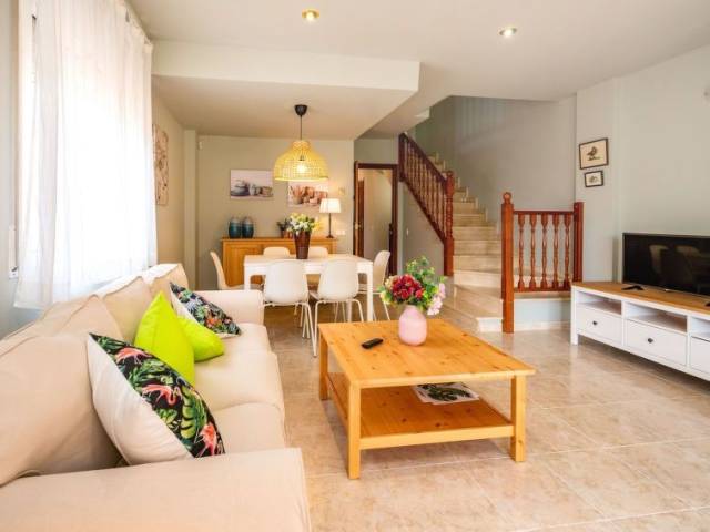 "Clavel", casa 4 estancias 190 m2. Espacioso y luminoso, con mobiliario confortable y moderno: salón-comedor con mesa de comedor, TV digital y calefacción de gas. Salida a la terraza-jardín. Cocina (4 fogones, horno, tostadora, microondas, congelador, cafetera eléctrica). WC separado. Planta superior: 1 dorm. con 1 cama de matrimonio (160 cm, 190 cm de longitud), baño/bidet/WC y calefacción de gas. Salida al balcón. 1 dorm. con 2 camas (90 cm, 190 cm de longitud), calefacción de gas. 1 dorm. con 1 cama (90 cm, 190 cm de longitud), calefacción de gas. Salida al balcón. Baño/bidet/WC. Planta superior 2: altillo con 1 sofá-cama doble y calefacción de gas. Salida al balcón. Terraza. Muebles de terraza. Vista al mar. El alojamiento dispone de: lavadora. Internet (Wifi, gratis). Plaza de aparcamiento (cubierto, 2 Coches). Adecuado para familias. HUTB059024
