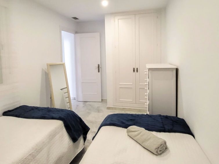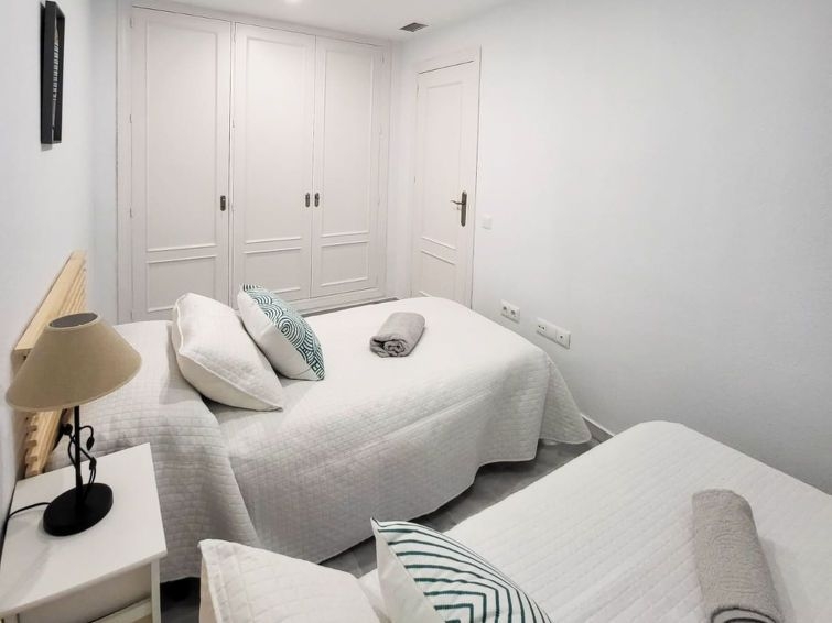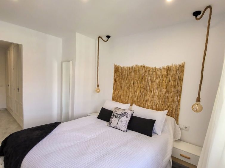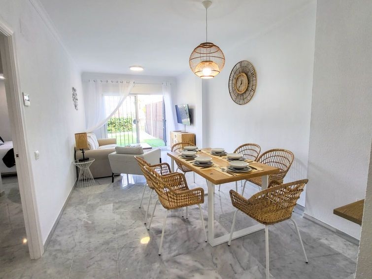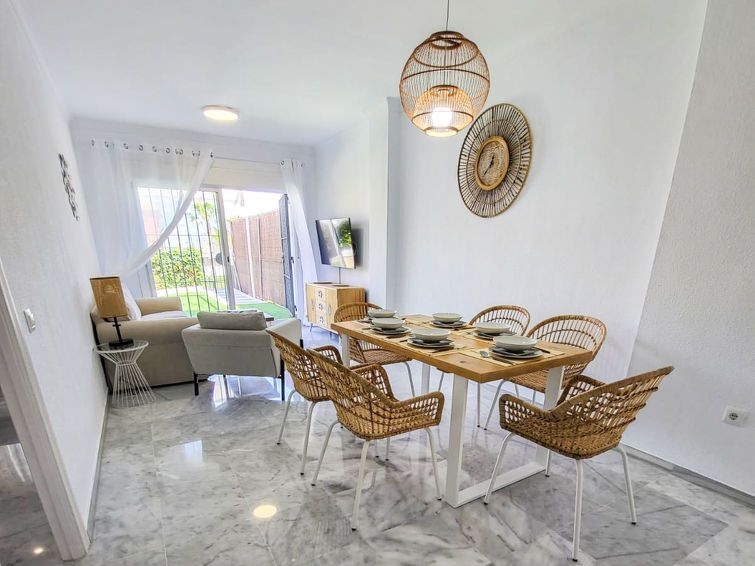 "Doñana", apartamento de 4 estancias 110 m2, en la planta baja. Luminoso, con mobiliario funcional y confortable: salón-comedor con TV digital y pantalla plana. Salida a la terraza. 1 dorm. con 1 cama de matrimonio (150 cm, 190 cm de longitud), baño/bidet/WC. 2 dorm., cada habitación con 2 camas (90 cm, 190 cm de longitud). Cocina abierta (horno, lavavajillas, 4 placas de vitrocerámica, tostadora, microondas, congelador, cafetera eléctrica). Ducha/WC. Aire acondicionado, aire caliente. 2 terrazas grandes. Muebles de terraza. Vista a la piscina y al jardín. El alojamiento dispone de: lavadora, plancha, trona, cuna hasta 2 años, secador de pelo. Internet (Wifi, gratis). Plaza de aparcamiento n. 121 (cubierto) junto a la casa. A tener en cuenta: adecuado para familias. Casa para no fumadores. VFT/CA/014002