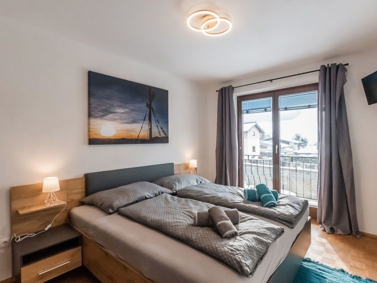 Apartamento de 3 estancias 75 m2, en planta superior. Vivienda adecuada para 4 adultos + 1 niño. Luminoso, reformado en 2022, con mobiliario agradable: planta superior: entrada. 2 dorm. dobles. Salida al balcón. Cocina-comedor (horno, lavavajillas, 4 placas de vitrocerámica, tostadora, hervidor de agua eléctrico, microondas, cafetera eléctrica) con mesa de comedor, TV cable y pantalla plana. Baño/ducha, WC separado, doble lavabo. Calefacción por suelo. Suelo de parquet, suelo de piedra natural. Balcón. Muebles de balcón. Vista al paisaje y a la localidad. El alojamiento dispone de: trona, cuna hasta 2 años (extra), secador de pelo. Internet (Wifi, gratis). A tener en cuenta: apartamento para no fumadores. Detector de humo, extintores. 50622-091048-2022