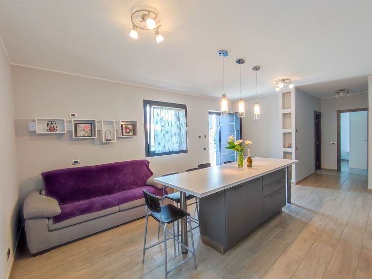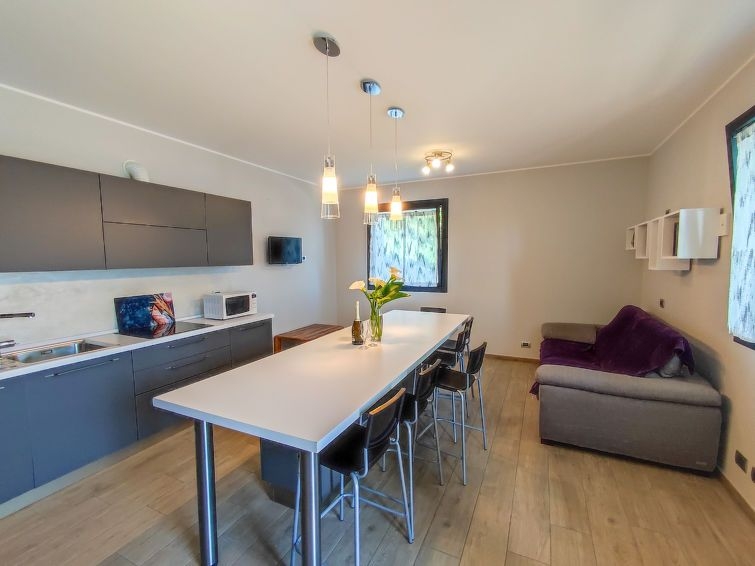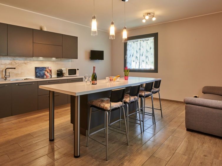 Apartamento de 3 estancias 70 m2, en la planta baja. Con mobiliario moderno y de estilo: salón-comedor con TV. Salida a la terraza. 1 dorm. doble. 1 dorm. con 1 x 2 literas. Cocina abierta (horno, lavavajillas, 4 Placas de inducción, microondas, congelador, cafetera eléctrica). Salida a la terraza. Ducha/bidet/WC, ducha hidromasaje. Calefacción de gas, calefacción por suelo. Suelo de piedra natural. Terraza grande 100 m2 parcialmente cubierta. Muebles de terraza, tumbonas (2). Vista panorámica espléndida al lago, a las montañas y al valle. El alojamiento dispone de: trona, cuna hasta 2 años. Internet (Wifi, gratis). Plaza de aparcamiento (2 Coches). A tener en cuenta: apartamento para no fumadores. Entrada privada. CIR: 013077-LNI-00001