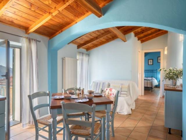 "Azzurro", apartamento de 2 estancias 50 m2 en el 1° piso. Luminoso, con mobiliario de buen gusto: 1 dorm. doble. Grande cocina-comedor (Estufa de gas, 4 fuegos, tostadora, hervidor de agua eléctrico, cafetera eléctrica) con mesa de comedor, 1 sofá-cama (160 cm), TV satélite. Ducha/bidet/WC. Calefacción de gas. Suelo de piedra natural. Balcón pequeño, jardín. Muebles de terraza, tumbonas (2). Vista panorámica bonita a las montañas y al valle. El alojamiento dispone de: lavadora, plancha, trona, cuna, secador de pelo. Internet (Wifi). 1 mascota / perro. CITRA:008064-AGR-0001
