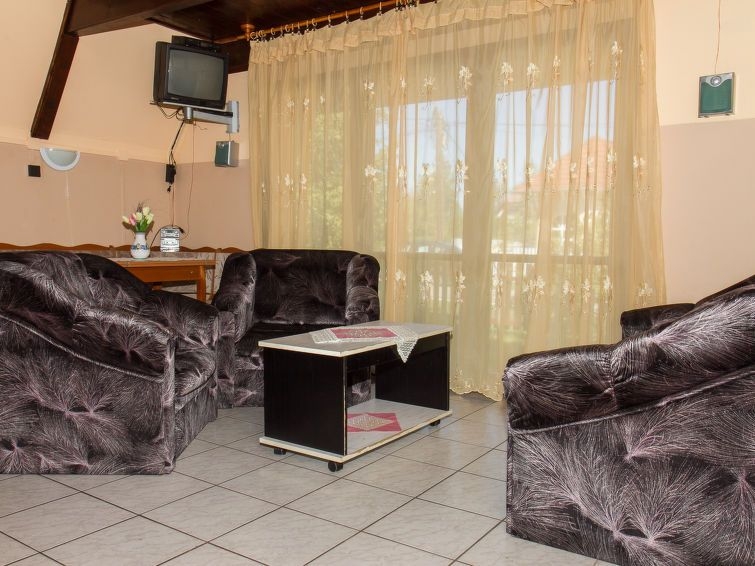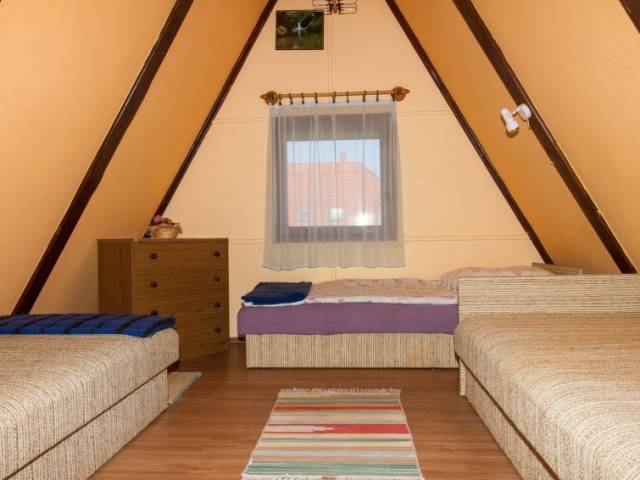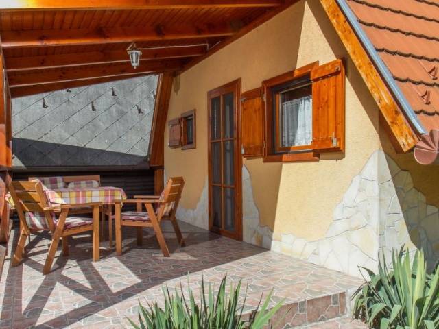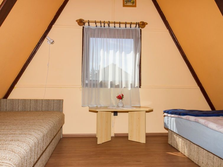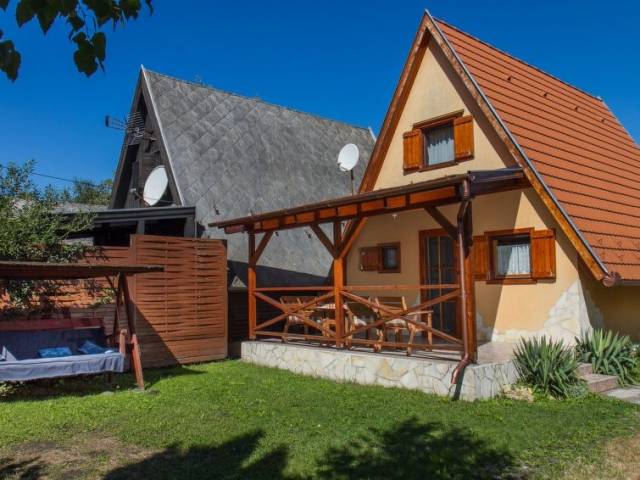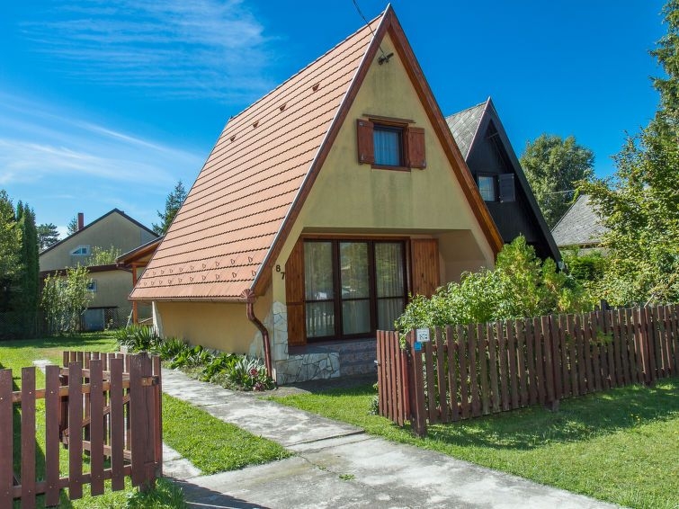 Balatonmáriafürdő: Casa de madera "Kamilla", pequeña. En la localidad, lugar tranquilo, soleado, a 100 m de un lago. Privado: jardín 150 m2 (vallado) con césped. En el inmueble: aire acondicionado (extra). Tienda de comestibles 800 m, restaurante 450 m, playa de césped 100 m. Casa 3 estancias 65 m2. Con mobiliario confortable: salón con TV. Salida a la terraza. Cocina abierta (4 fogones, horno, microondas, congelador). Ducha/WC. Ningún tipo de calefacción. Planta superior: (escalera empinada) 2 dorm., cada habitación con 2 camas. Terraza. Muebles de terraza. Plaza de aparcamiento. MA19020202