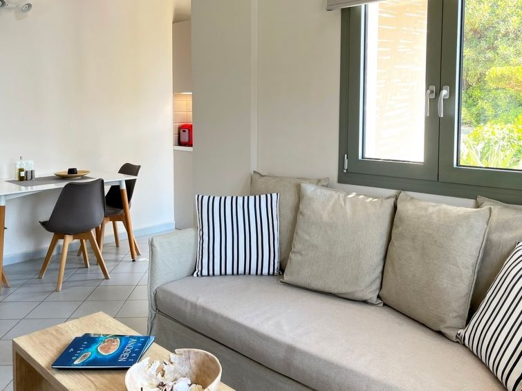 "Tessera", apartamento de 2 estancias 44 m2. Con mobiliario confortable y bonito: salón-dormitorio abierto con 2 sofás-cama y TV satélite (pantalla plana). Salida a la terraza. 1 dorm. doble con 1 cama doble. Cocina abierta (2 placas de vitrocerámica, microondas, cafetera eléctrica, Cápsulas de café (Tassimo) extra). Ducha/WC. Aire acondicionado. Terraza. Vista lateral al mar y al paisaje. El alojamiento dispone de: plancha, secador de pelo. Internet (Wifi, gratis). A tener en cuenta: adecuado para familias. Casa para no fumadores. 1056936