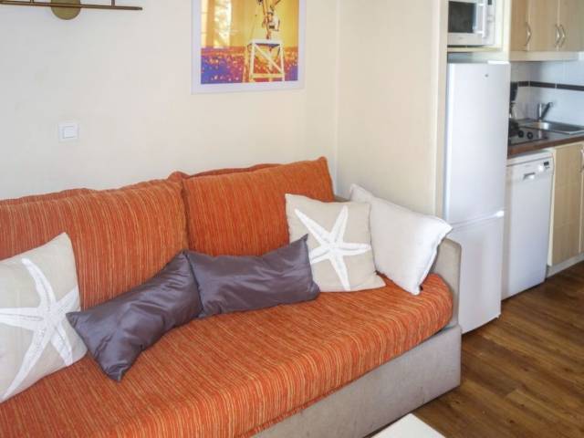 Apartamento en dos niveles 3 estancias 40 m2 en el 2° piso. Con mobiliario confortable y bonito: salón-comedor con ventanal con TV y aire acondicionado. Salida a la terraza. 1 dorm., pequeño con 1 x 2 literas (90 cm, 190 cm de longitud). Cocina abierta (lavavajillas, 4 placas de vitrocerámica, microondas, cafetera eléctrica). Ducha/WC. Calefacción eléctrica. Planta superior: 1 dorm. con ventanal con 1 cama de matrimonio (1 x 140 cm, 190 cm de longitud), TV. Salida a la terraza. Baño/WC. Terraza 10 m2, terraza 15 m2. Muebles de terraza. Vista panorámica muy bonita al mar y a la piscina. El alojamiento dispone de: lavadora. Internet (Wifi, gratis). A tener en cuenta: detector de humo. 06029013282AK