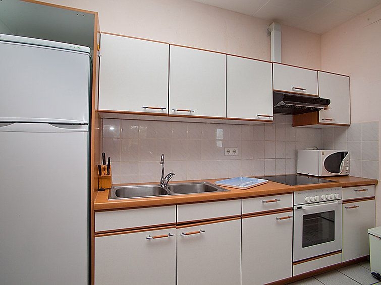 Apartamento de 3 estancias 70 m2, en planta superior. Con mobiliario funcional y confortable: salón-comedor con TV satélite y aire acondicionado. Salida a la terraza. 1 dorm. con 1 cama de matrimonio. Salida a la terraza. 1 dorm. con 2 camas. Cocina abierta (horno, X placas de vitrocerámica, microondas, cafetera eléctrica). Baño/WC. Calefacción por el suelo. Terraza grande. Muebles de terraza. Vista al mar, a la piscina y al jardín. El alojamiento dispone de: lavadora. Internet (Wifi, gratis). Adecuado para familias. 2 mascotas / perros. HUTTE000937
