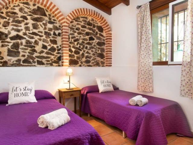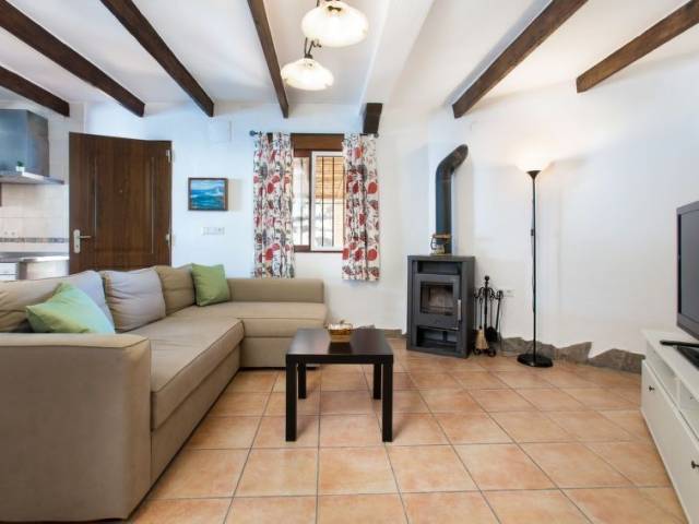 Casa rural 3 estancias 85 m2. Con mobiliario funcional y confortable: salón-comedor con TV digital y estufa de lena. Salida a la terraza, a la piscina. 1 dorm. con 2 camas (90 cm, 190 cm de longitud). 1 dorm. con 1 cama de matrimonio (135 cm, 190 cm de longitud). Cocina abierta (4 placas de vitrocerámica, tostadora, hervidor de agua eléctrico, microondas, cafetera eléctrica). Ducha/WC. Terraza grande. Muebles de terraza, barbacoa, tumbonas. Vista lateral al mar y al paisaje. El alojamiento dispone de: lavadora, plancha, trona, cuna hasta 3 años, secador de pelo. CR/MA/01154