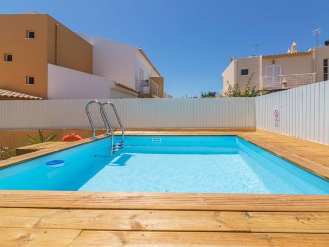 A 3 km de Centro Armação de Pera: Casa adosada "Sunny Home", bonita, agradable de 2 plantas del año 2003. En las afueras de la localidad, a 500 m del centro de Pera, lugar tranquilo area residencial (villas), a 3 km del mar. Privado: terreno 172 m2 (vallada), patio, piscina rectangular (3 x 3 m, 115 - 115 cm de profundidad, Disponible por temporada: 01.Ene. - 31.Dic.). Barbacoa. En el inmueble: Wifi, lavadora. Cambio de sábanas (suplemento extra). Cambio de toallas (suplemento extra). Posibilidad de limpieza (extra). Transfer desde el aeropuerto (extra). Aparcamiento junto a la casa. Tienda 400 m, tienda de comestibles 600 m, supermercado 2.4 km, restaurante, bar 500 m, panadería 2.4 km, café 170 m, internet café 4.9 km, bar al aire libre 4.9 km, playa de arena "Praia dos Pescadores" 3 km. Puerto deportivo 8.3 km, campo de golf (18 hoyos) 3.9 km, escuela de surf 5.4 km, centro ecuestre 2.6 km. Atracciones en los alrededores: Zoomarine 2.8 km, Albueira 13.8 km, Algarve Shopping 5.9 km, Aqualand 3.7 km, Golf Course Salgados 3.8 km, Praia Galé Oeste 5.1 km. Lagos conocidos fácilmente accesibles: Lagoa Dos Salgados 3.7 km. Zona de senderismo Monchique. A tener en cuenta: coche recomendable. Adecuado para familias. Grupos de jóvenes sólo bajo petición. Bajo petición: transfer desde el aeropuerto a la vivienda de vacaciones. Carga y descarga de equipaje posible en la casa de vacaciones. Vecindario muy sensible a ruidos. Se ruega respetar la tranquilidad y normas de buen comportamiento. "Sunny Home", casa adosada 4 estancias 136 m2 en 2 plantas. Con mobiliario muy funcional: salón-comedor con 1 sofá-cama doble, chimenea, mesa de comedor, TV, canales internacionales, pantalla plana y aire acondicionado. 1 dorm. con 2 camas (90 cm, 190 cm de longitud), aire acondicionado. Cocina (4 fogones, horno, lavavajillas, microondas, congelador, cafetera eléctrica). Salida al balcón. Ducha/WC. Planta superior: 1 dorm. con 1 cama de matrimonio y aire acondicionado. 1 dorm. con 2 camas (90 cm, 190 cm de longitud), aire acondicionado. Baño/ducha/WC. Muebles de terraza, barbacoa, tumbonas (2). El alojamiento dispone de: lavadora, plancha. Internet (Wifi). Plaza de aparcamiento. Adecuado para familias. 71938/AL