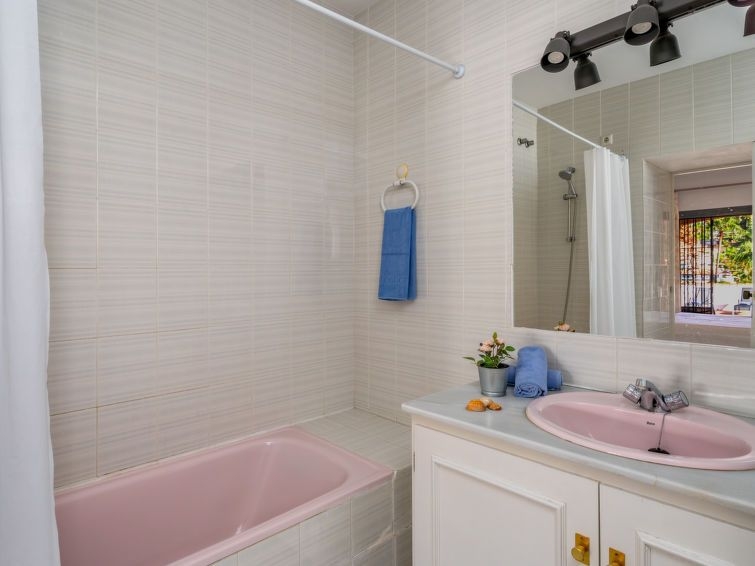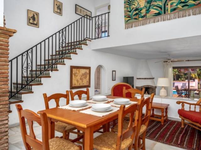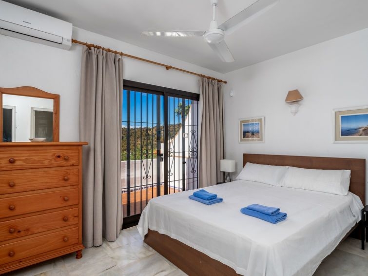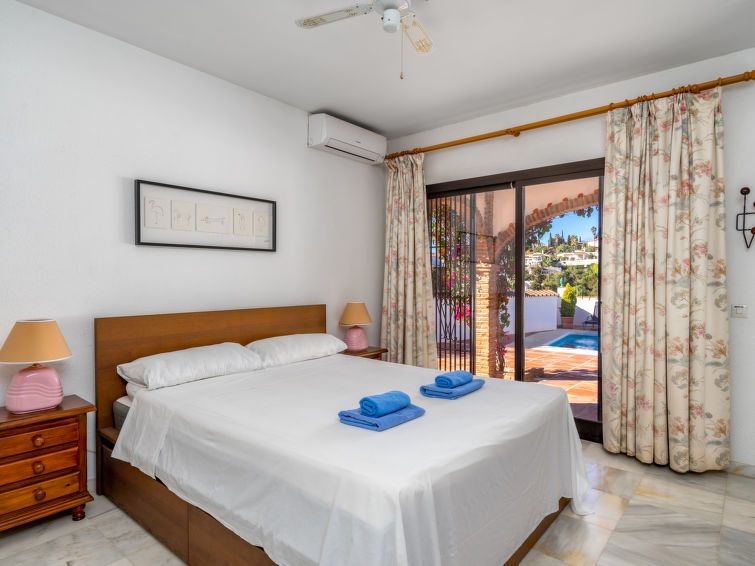 Sitio de Calahonda: Villa "Luna", agradable, confortable de 2 plantas, adosada por un lado. En la localidad, a 700 m del centro, a 5 km del centro de La Cala de Mijas, a 15 km del centro de Marbella, lugar tranquilo, soleado, a 1.2 km del mar, en una calle sin salida. Privado: piscina (9 x 4 m, Disponible por temporada: 01.Ene. - 31.Dic.). Terraza, muebles de jardín, barbacoa, aparcamiento junto a la casa. Supermercado 1 km, restaurante 1 km, bar 1 km, playa de arena 1.2 km. Puerto deportivo 3 km, campo de golf (9 hoyos) 1.5 km. Atracciones en los alrededores: Málaga 40 km. Grupos de jóvenes sólo bajo petición. Vecindario muy sensible a ruidos. Se ruega respetar la tranquilidad y normas de buen comportamiento. "Luna", casa 4 estancias 200 m2. Con mobiliario confortable y rústico: salón con TV digital y aire acondicionado. Salida al jardín. Comedor. 1 dorm. con 1 cama de matrimonio (150 cm), baño/WC (privado) radio. Cocina (horno, lavavajillas, 4 placas de vitrocerámica, tostadora, hervidor de agua eléctrico, microondas, congelador, cafetera eléctrica). WC separado. Calefacción eléctrica, calefacción de gas. Planta superior: 1 dorm. con 1 cama de matrimonio (150 cm, 200 cm de longitud), baño/WC (privado) aire acondicionado. Salida a la terraza con 1 cama de matrimonio (150 cm, 200 cm de longitud), baño/WC (privado) aire acondicionado. Salida a la terraza. Terraza grande, terraza-jardín, jardín. Muebles de terraza, barbacoa, tumbonas. Vista a la piscina y al paisaje. El alojamiento dispone de: lavadora, plancha, trona, cuna, secador de pelo. Internet (Wifi, gratis). Plaza de aparcamiento. Adecuado para familias. VFT/MA/010881