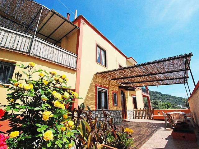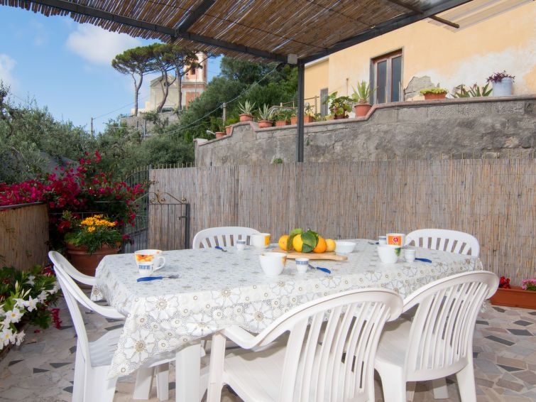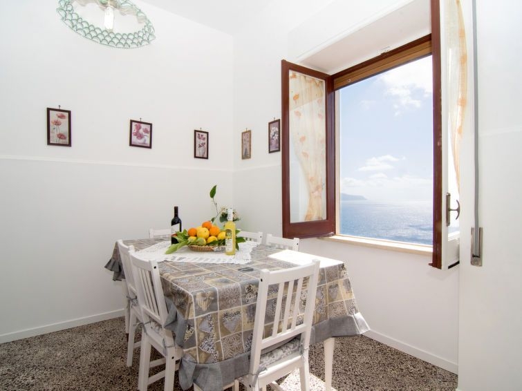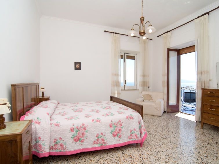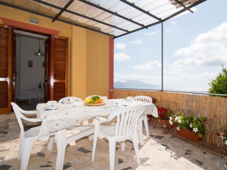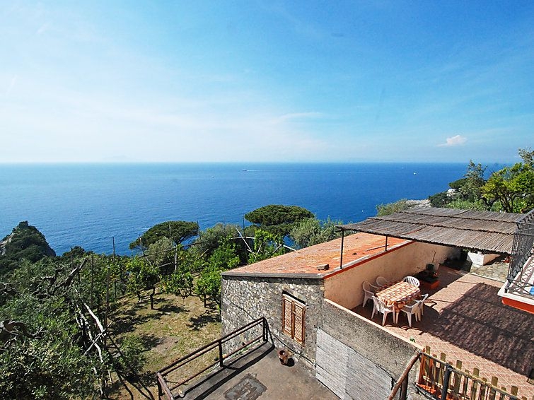 Apartamento de 2 estancias 80 m2 en el 1° piso. Luminoso, parcialmente reformado en 2020, con mobiliario sencillo y funcional: 1 dorm., grande con ventanal con 3 camas y aire acondicionado. Salida al balcón. 1 dorm. doble con ventanal con TV y aire acondicionado. Salida a la terraza. Cocina (4 fogones, horno, congelador) con mesa de comedor. Salida a la terraza-jardín. Baño/bidet/WC. Aire acondicionado, aire caliente, calentador (60 litros). Calefacción disponible desde el 01.11. al 31.03. Balcón pequeño, terraza 15 m2, terraza-jardín 35 m2, parcialmente cubierta. Muebles de terraza, tumbonas (4). Vista panorámica espléndida al mar, al jardín, al paisaje, a la localidad y Capri Island. El alojamiento dispone de: lavadora, trona, cuna (extra). Internet (Wifi, gratis). Plaza de aparcamiento n. 1 (cubierto, vallada). Adecuado para familias. 15063044EXT0049