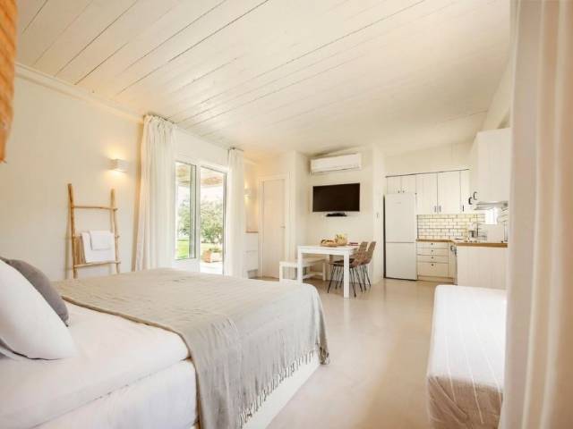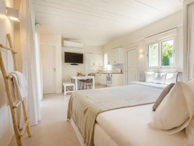 "Lefko Spitaki", villa estudio en la planta baja. Vivienda adecuada para 2 adultos. Completamente reformada en 2018, con mobiliario bonito y agradable: salón-dormitorio abierto con 1 cama doble, ducha/WC y TV satélite (pantalla plana), CD, DVD y aire acondicionado. Salida al jardín. Cocina (horno, lavavajillas, congelador) con mesa de comedor. Muebles de terraza, rincón para sentarse. Vista muy bonita al jardín. El alojamiento dispone de: Internet (Wifi, gratis). 1471K91000413601